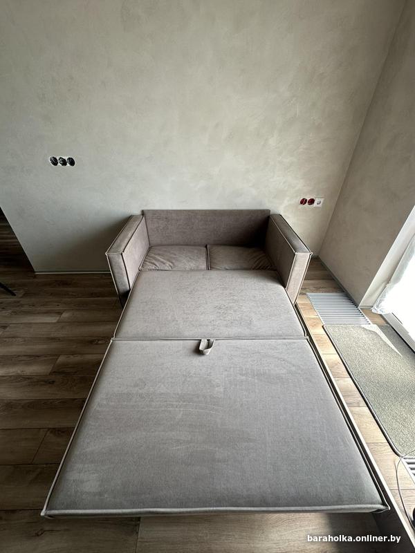 Диван раскладной. Абсолютно новый. Есть ящик для хранения. Материал - износостойкий велюр. Ножки - массив дерева. Спальное место 120х190см. Габариты дивана указаны на фото.