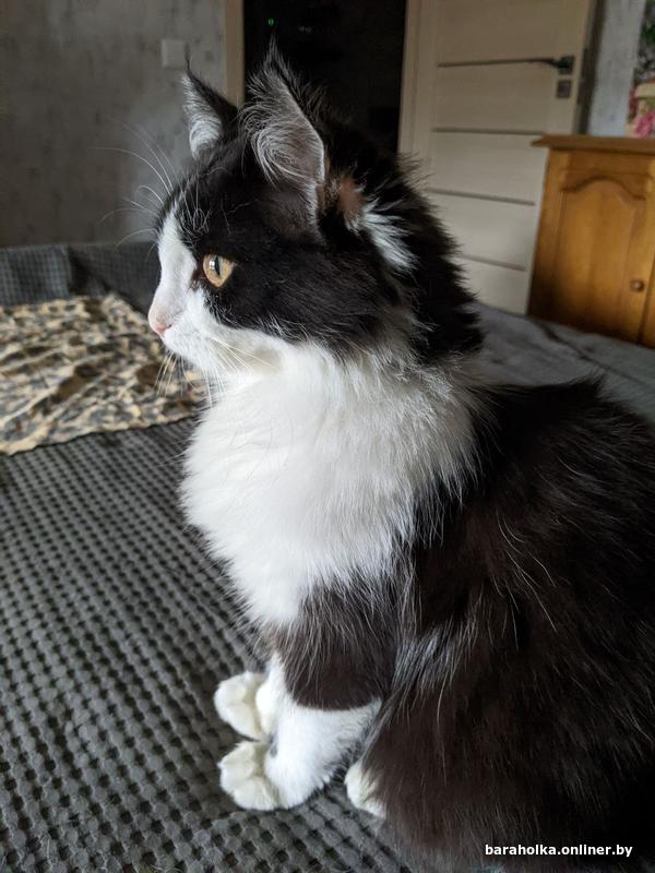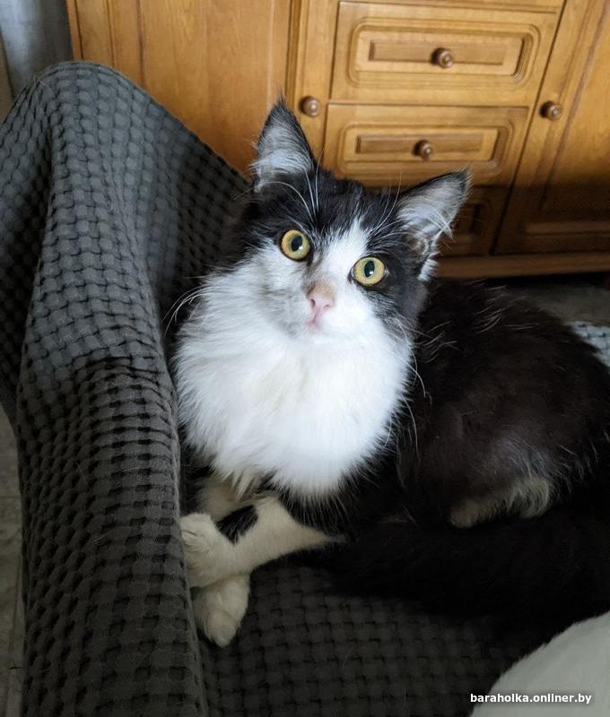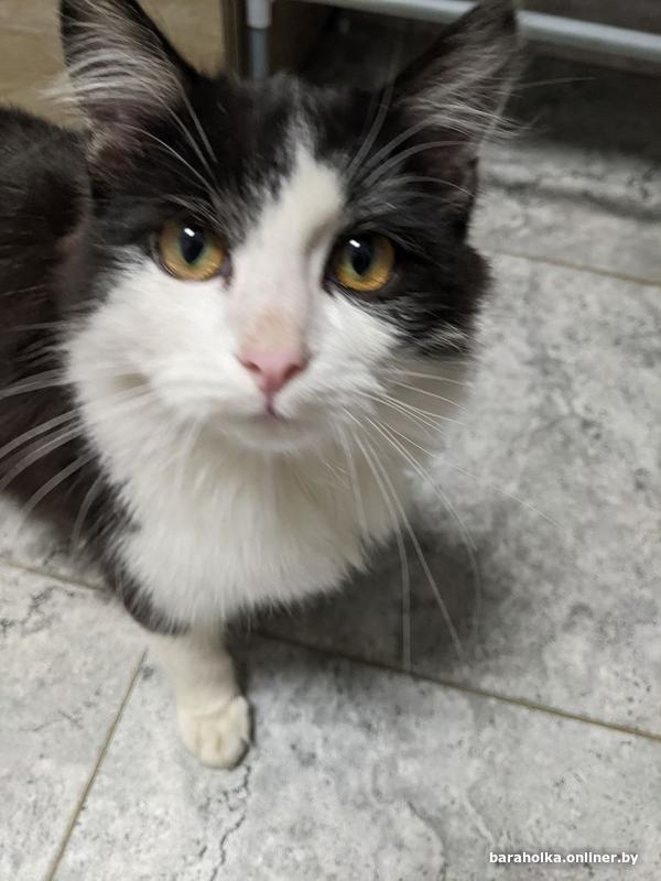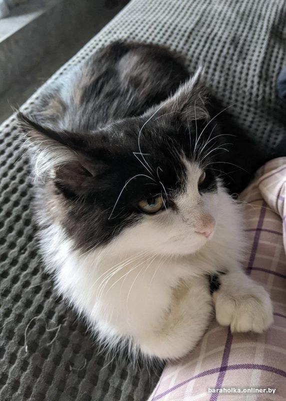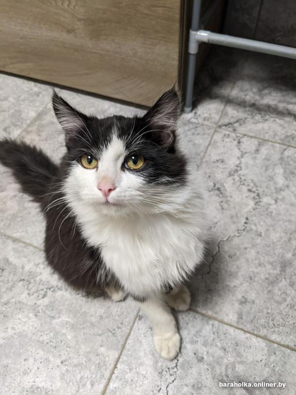 Молодая кошка (9 мес.). Очень ласковая, добрая, игривая, отлично ладит с другими животными, в т.ч. с собакой. Не стерилизована, к лотку приучена. Окрас чёрно-белый, в меру пушистая.