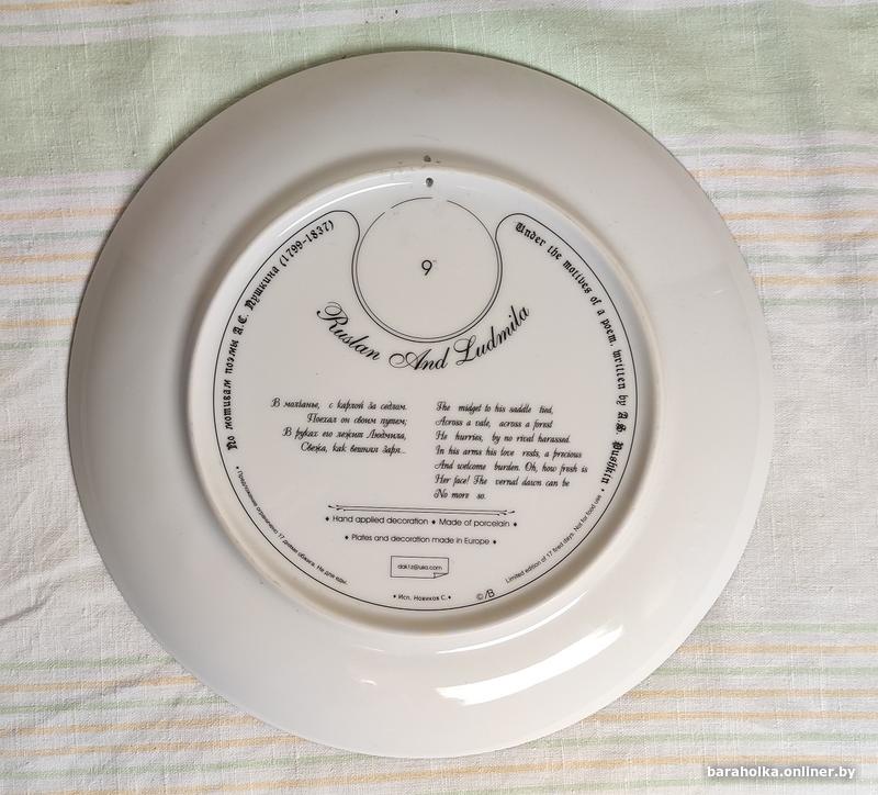 –по мотивам поэмы А.С. Пушкина (1799-1837) «Руслан и Людмила» (Ruslan and Ludmila) («В молчанье, с карлой за седлом, Поехал он своим путем, В руках его лежит Людмила, Свежа, как вешняя Заря»), изготовлено из фарфора, деколь, украшения ручной работы, европейское производство, обжиг 17 дней. диаметр 268 мм, глубина 20 мм. Состояние: коллекционное, без приобретенных дефектов, на тыльной стороне тарелки отверстие в фарфоре для подвешивания тарелки, не для еды.