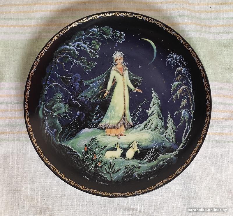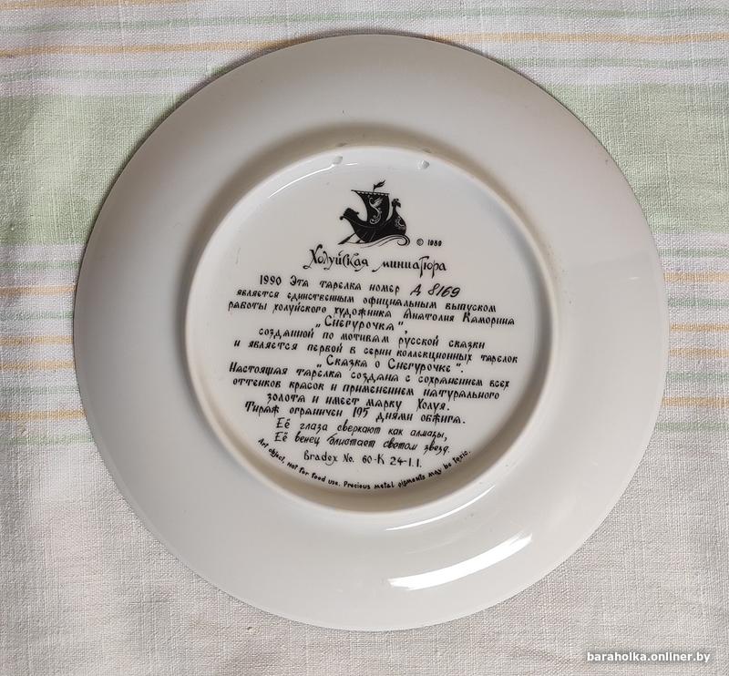 – Холуйская миниатюра, 1990 год. Эта тарелка номер Д8169 является единственным официальным выпуском работы холуйского художника Анатолия Каморина «Снегурочка» («Её глаза сверкают как алмазы, Её венец сверкает светом звёзд»), созданной по мотивам русской сказки и является первой в серии коллекционных тарелок «Сказка о Снегурочке». Настоящая тарелка создана с сохранением всех оттенков красок и применением натурального золота и имеет марку Холуя (клеймо черного цвета). Тираж ограничен 195 днями обжига. Диаметр 195 мм, глубина 13 мм. Изготовлено из фарфора, украшения ручной работы, номер в каталоге Bradex 60-К24-1.1. На лицевой стороне мелким шрифтом надпись «п.Холуй «Снегурочка» А.Каморин». Состояние: коллекционное, без приобретенных дефектов, без сертификата и фирменной упаковки. На тыльной стороне тарелки два отверстия в фарфоре для подвешивания тарелки, арт-объект, не для пищевого использования, пигменты из драгоценных металлов могут быть токсичными. Цена 205 рб.