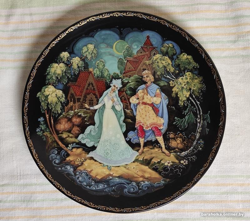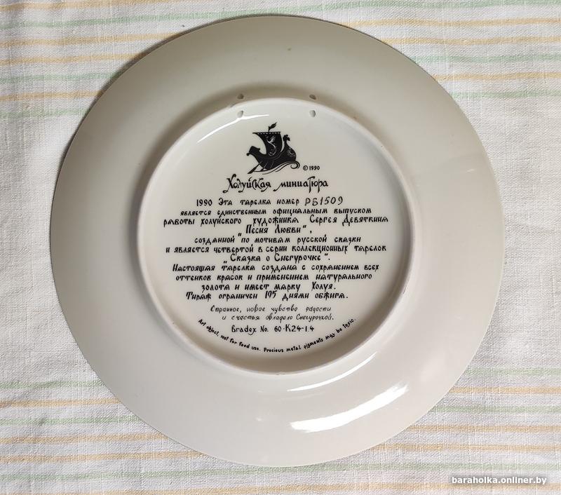 – Холуйская миниатюра (одна из школ лаковой миниатюры русских художественных промыслов), 1990 год. Эта тарелка РБ1509 является единственным официальным выпуском работы холуйского художника Сергея Девяткина «Песня Любви» («Странное, новое чувство радости и счастья овладело Снегурочкой»), созданной по мотивам русской сказки и является четвертой в серии коллекционных тарелок «Сказка о Снегурочке». Настоящая тарелка создана с сохранением всех оттенков красок и применением натурального золота и имеет марку Холуя (клеймо черного цвета). Тираж ограничен 195 днями обжига. Диаметр 200 мм, глубина 13 мм. Изготовлено из фарфора, украшения ручной работы, номер в каталоге Bradex 60-К24-1.4. На лицевой стороне надпись мелким шрифтом золотом ««Снегурочка и Лель» п.Холуй С. Девяткин». Состояние: коллекционное, без приобретенных дефектов, без сертификата и фирменной упаковки. На тыльной стороне тарелки два отверстия в фарфоре для подвешивания тарелки, арт-объект, не для пищевого использования, пигменты из драгоценных металлов могут быть токсичными. Цена 255 рб.