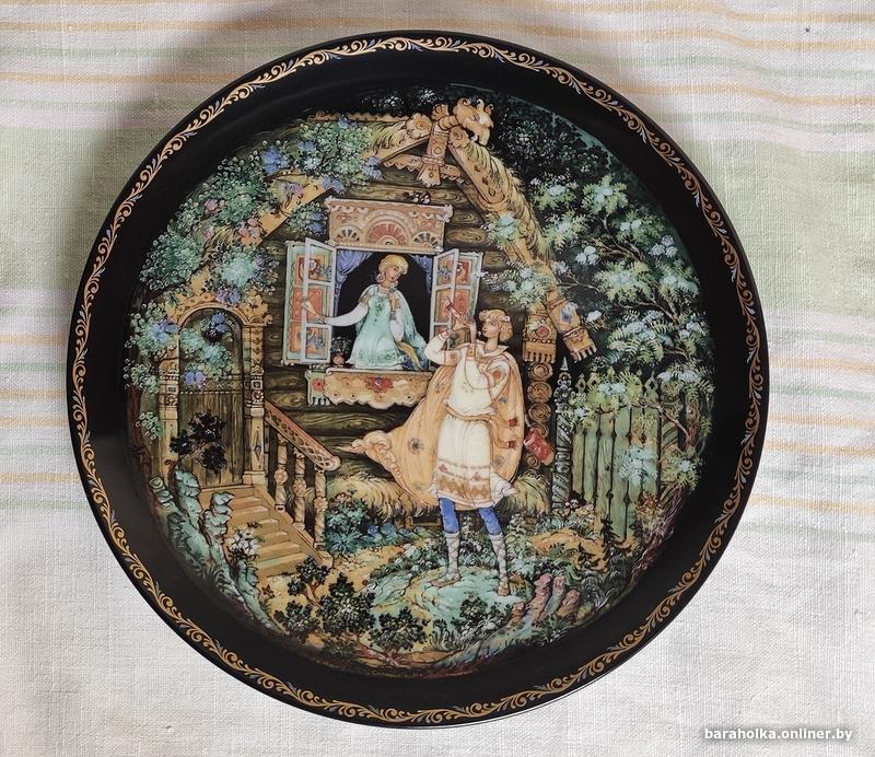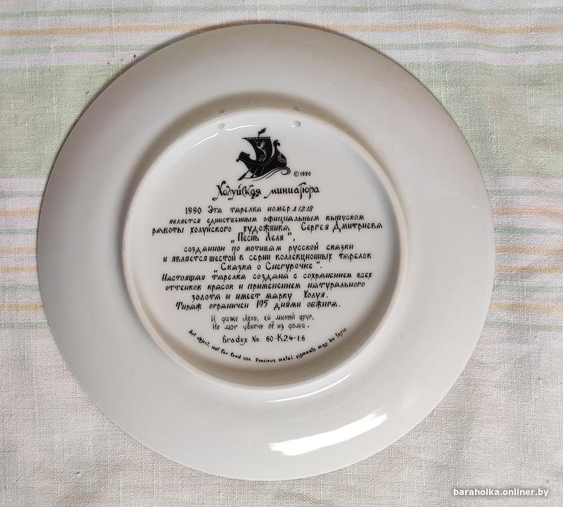 – Холуйская миниатюра (одна из школ лаковой миниатюры русских художественных промыслов), 1990 год. Эта тарелка А1218 является единственным официальным выпуском работы холуйского художника Сергея Дмитриева «Песнь Леля» («И даже Лель, ей милый друг, Не мог увлечь её из дома»), созданной по мотивам русской сказки и является шестой в серии коллекционных тарелок «Сказка о Снегурочке». Настоящая тарелка создана с сохранением всех оттенков красок и применением натурального золота и имеет марку Холуя (клеймо черного цвета). Тираж ограничен 195 днями обжига. Диаметр 195 мм, глубина 9 мм. Изготовлено из фарфора, украшения ручной работы, номер в каталоге Bradex 60-К24-1.6. На лицевой стороне мелким шрифтом золотом надпись «п.Холуй «Снегурочка»-«Лель» Дмитриев С.»). Состояние: коллекционное, без приобретенных дефектов, без сертификата и фирменной упаковки. На тыльной стороне тарелки два отверстия в фарфоре для подвешивания тарелки, арт-объект, не для пищевого использования, пигменты из драгоценных металлов могут быть токсичными. Цена 205 рб.
