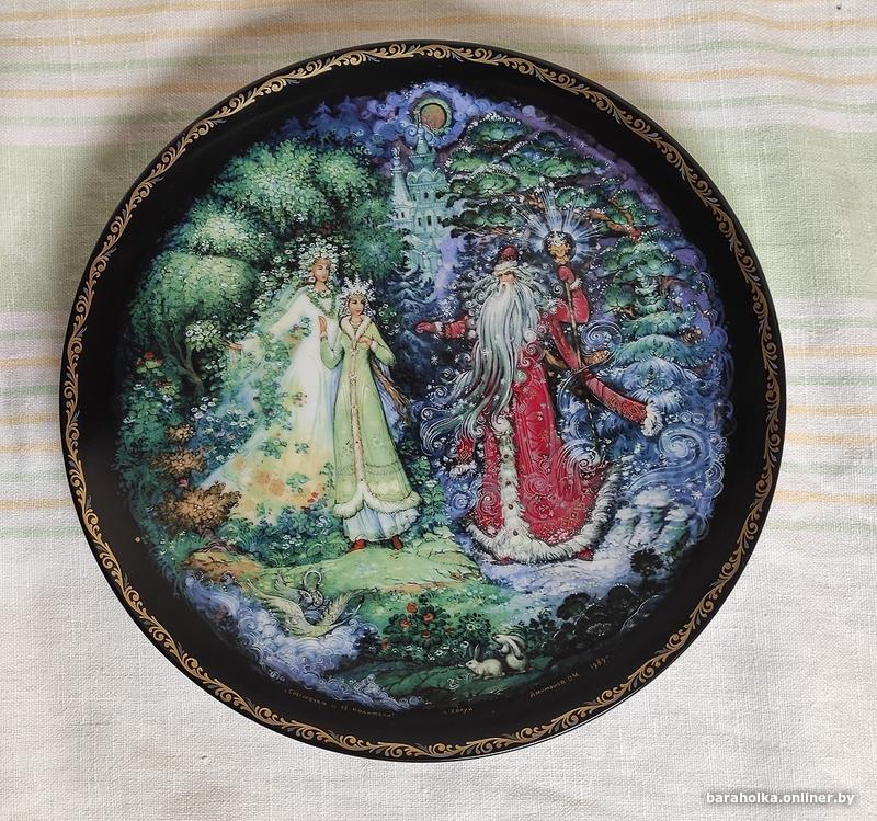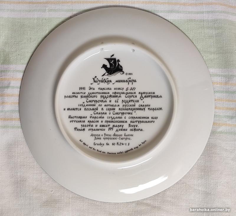 – Холуйская миниатюра, 1991 год. Эта тарелка Б781 является единственным официальным выпуском работы холуйского художника Сергея Дмитриева «Снегурочка и её родители» («Мороза и Весну связало вместе, Дитя прекрасное - Снегурка»), созданной по мотивам русской сказки и является восьмой в серии коллекционных тарелок «Сказка о Снегурочке». Настоящая тарелка создана с сохранением всех оттенков красок и применением натурального золота и имеет марку Холуя (клеймо черного цвета). Тираж ограничен 195 днями обжига. Диаметр 195 мм, глубина 9 мм. Изготовлено из фарфора, украшения ручной работы, номер в каталоге Bradex 60-К24-1.8. На лицевой стороне надпись мелким шрифтом золотом «Снегурочка и её родители» п.Холуй Дмитриев С.М. 1989г». Состояние: коллекционное, без приобретенных дефектов, без сертификата и фирменной упаковки. На тыльной стороне тарелки два отверстия в фарфоре для подвешивания тарелки, арт-объект, не для пищевого использования, пигменты из драгоценных металлов могут быть токсичными. Цена 255 рб.