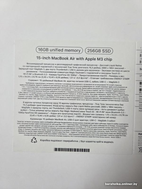 Ноутбук Apple Macbook Air 15" M3 2024 MC9F4 16gb/256gb