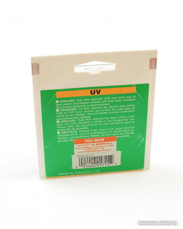 Светофильтр HOYA HMC UV (0) 77 mm ультрафиолетовый с многослойным просветлением Фильтр будет особенно необходим при работе в горах и на море. Светофильтр обеспечит ежедневную защиту от попадания грязи, пыли, капель воды и отпечатков пальцев на линзу объектива. Оправа светофильтра выполнена из алюминиевого сплава, что придает дополнительную защиту объективу. Благодаря более мягкой структуре металла, при ударе алюминиевые оправы светофильтров HOYA поглощают часть энергии за счет деформации. Замена светофильтра намного дешевле замены всего объектива. - 150 рублей. +375296061068