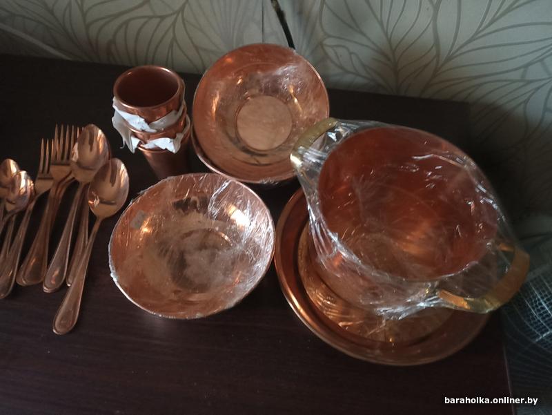 Набор посуды. Медь. Новое. 4 миски, 4 стакана, кастрюлька, блюдо. В подарок столовый набор вилок/ложек- нержавейка под медь.