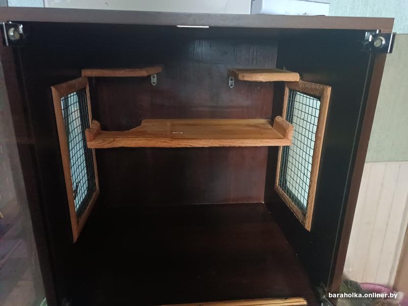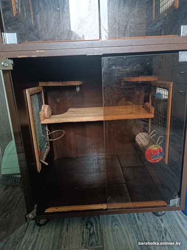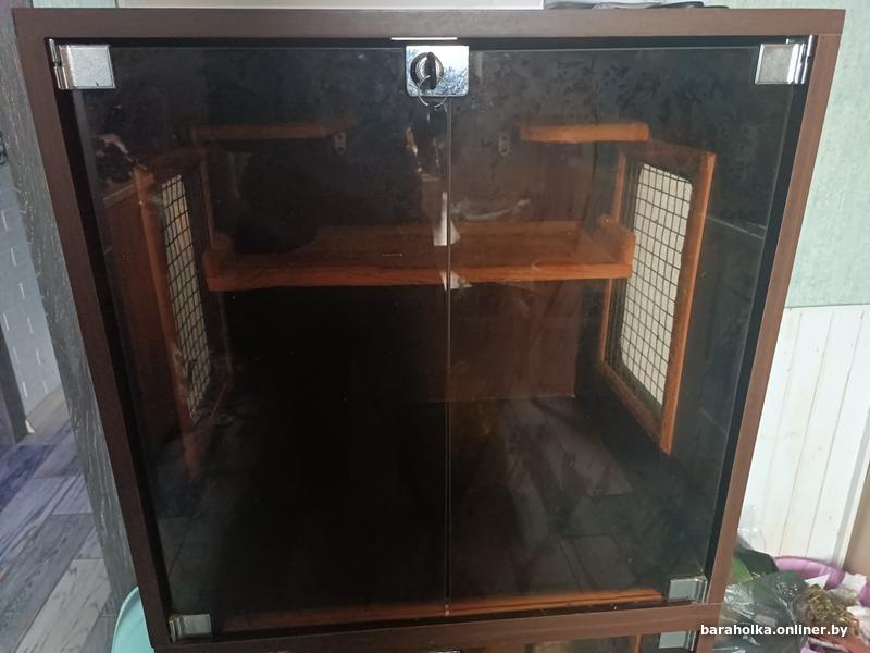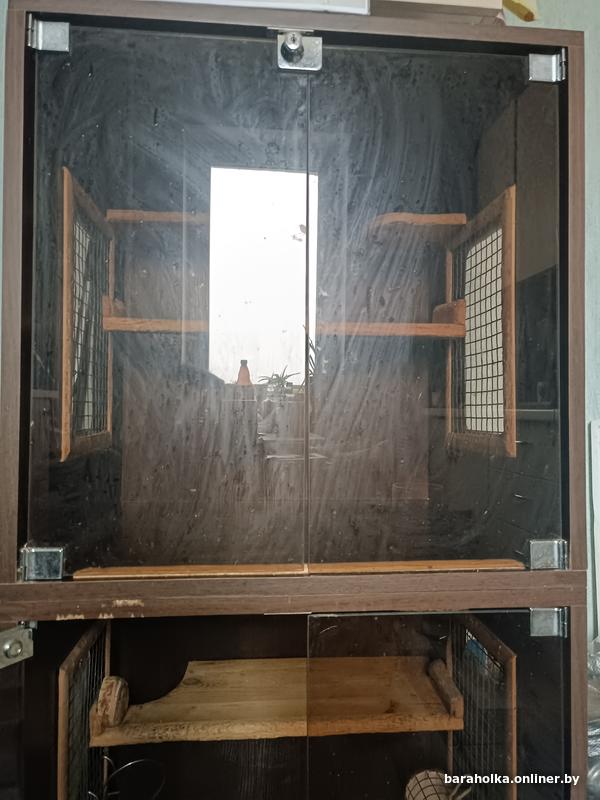 Продается витрина для содержания шиншилл.Материал - ДСП, дерево. Дверцы - стекло. Состоит из двух независимых секций ( ставятся друг на друга) . Каждая 60х60х60. Нижняя секция на колесиках. Общая высота витрины 127 см. Дополнительно отдаю гранитные охладительные плитки ( для летней жары)