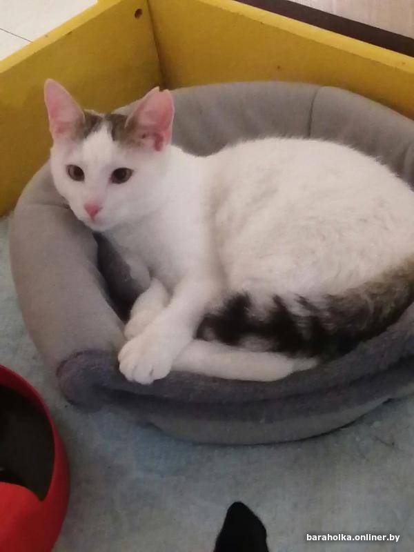 Ласковая кошечка Алиса, 7 месяцев. Стерилизована, привита, обработана, ходит в лоток. ПЦР на лейкоз и иммунодефицит отрицательны. Очень игривая. Белая с полосатым хвостиком, гладкошерстная.