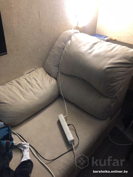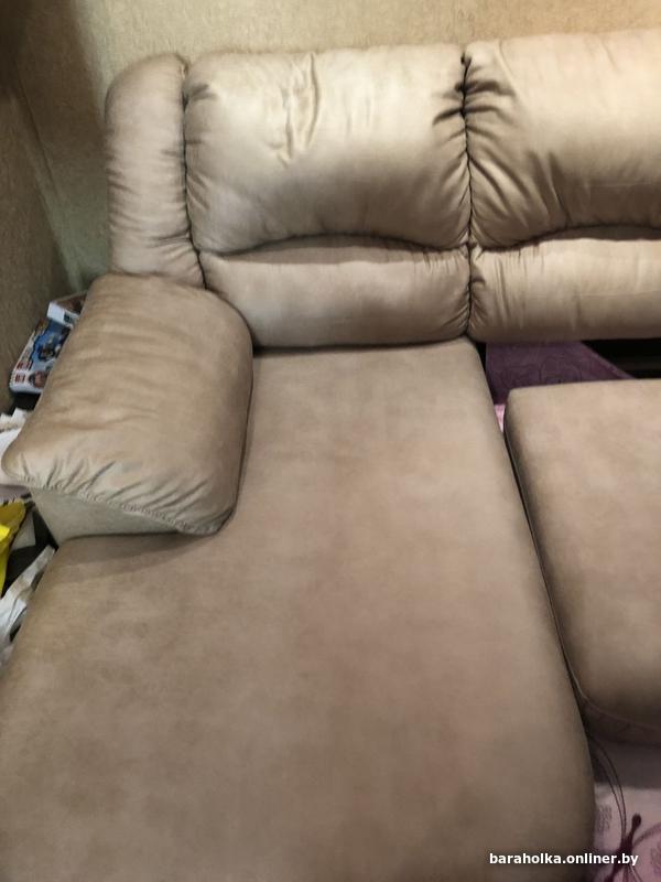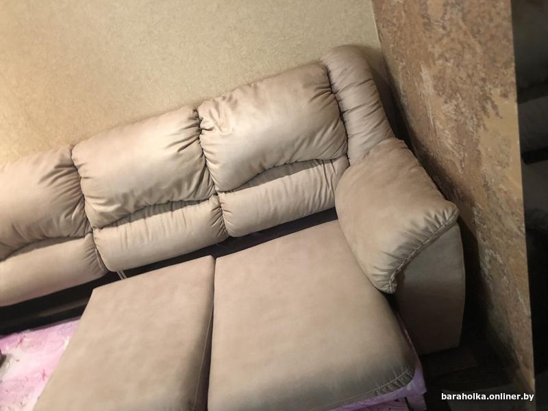 Диван угловой состоит из трех секций .раскладываться на две полуторные кровати .обивка красивая .требуется химчисткам ,мелкий ремонт.самовывоз .размер длина 4 метра и угол полтора .делали под заказ .тел для связи +375447775154Минск