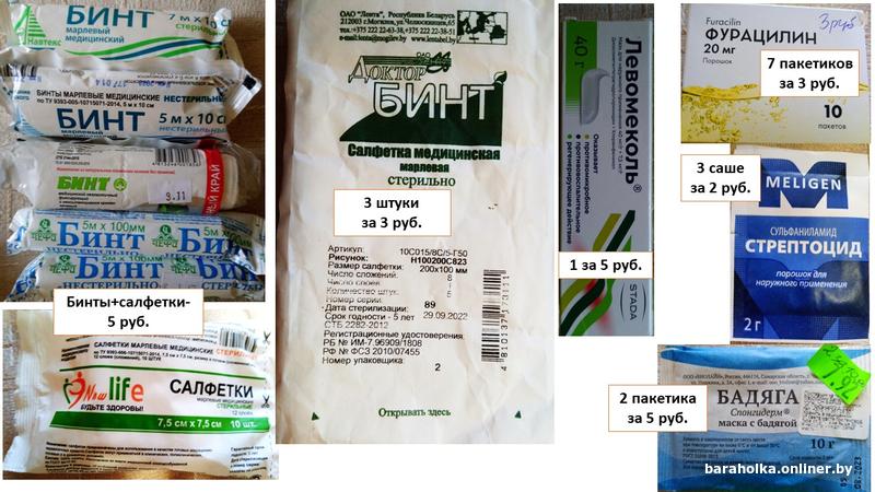2. Средства по обработке/уходу за ранами/ушибами с действующими сроками хранения: пластыри медицинские самоклеящиеся, салфетки,бинты; стрептоцид/фурацилин/бадяга–в порошке, левомеколь(мазь). Наличие и цена указаны на фото