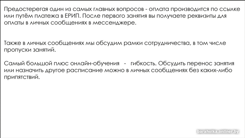 Для комфортного обучения Вам нужен лишь компьютер или ноутбук и стабильное интернет-соединение. Остальное - это моя работа