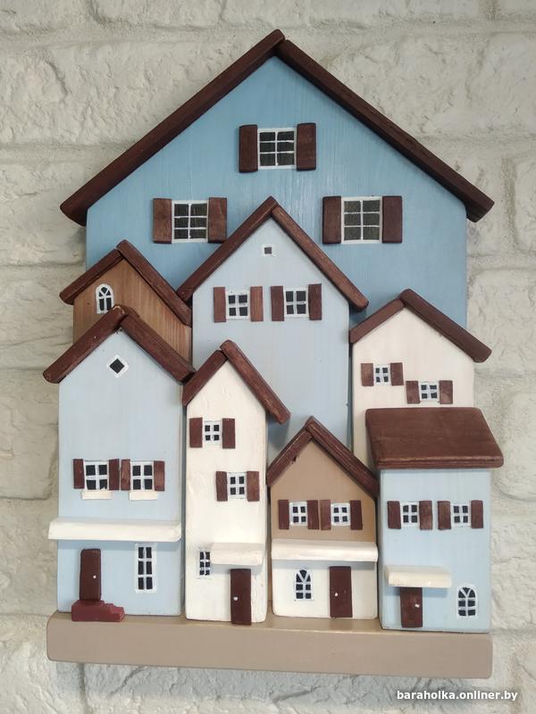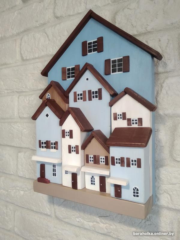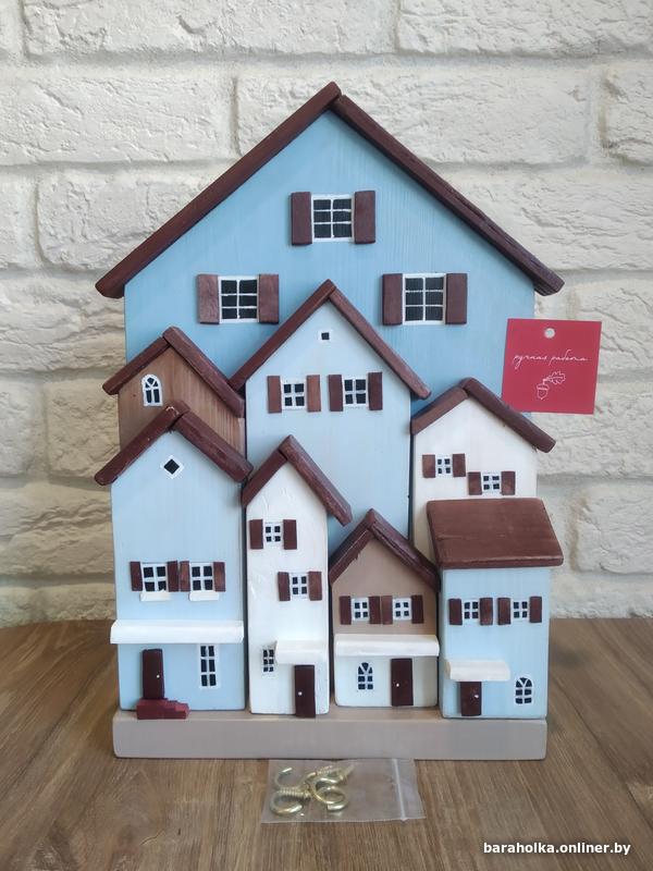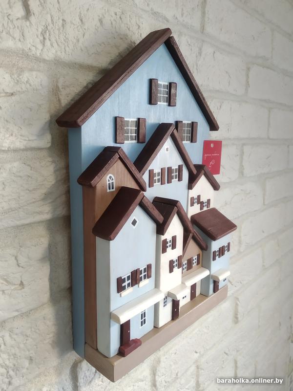 Объемный домик- ключница ручной работы будет отличным подарком и украшением интерьера для Вас и Ваших близких. Можно использовать как настенную ключницу, для чего на задней стенке есть крепления или как отдельный интерьерный предмет для размещения на полке или подоконнике. В этом случае прилагаются 4 подвеса. Изготовлен из дерева, покрыт акриловыми красками и лаком. Никакой заводской точности, только руки и простой инструмент. Доставка Европочта, Белпочта. Стоимость указана с учётом доставки. Размер 22х31 (h)см, толщина 6 см.п