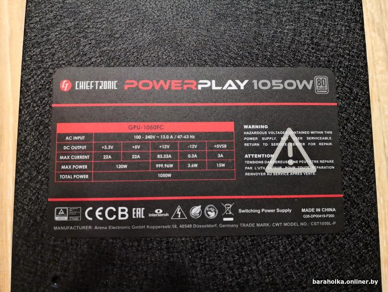 Chieftec Chieftronic PowerPlay GPU-1050FC, 1050 Вт, активная PFC, платиновый сертификат, вентилятор 140 мм, полностью модульный, 1x 12В 83.3А. Все кабели в комплекте! В идеальном состоянии, не вскрывался. Использовался в обычном домашнем компьютере, недолго. Вытянет что угодно!