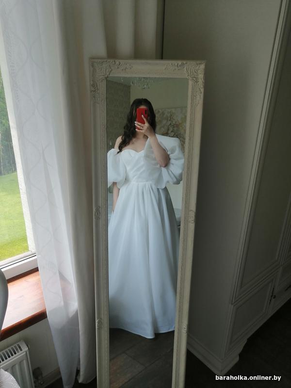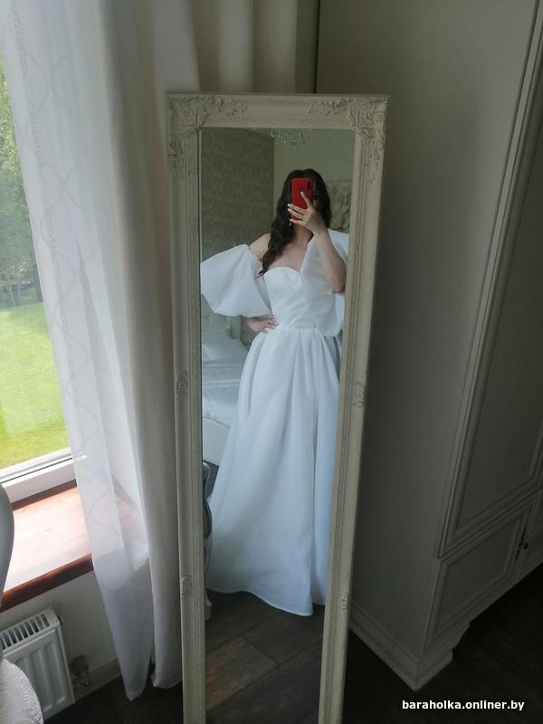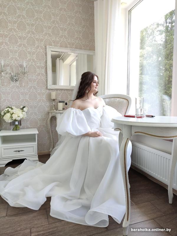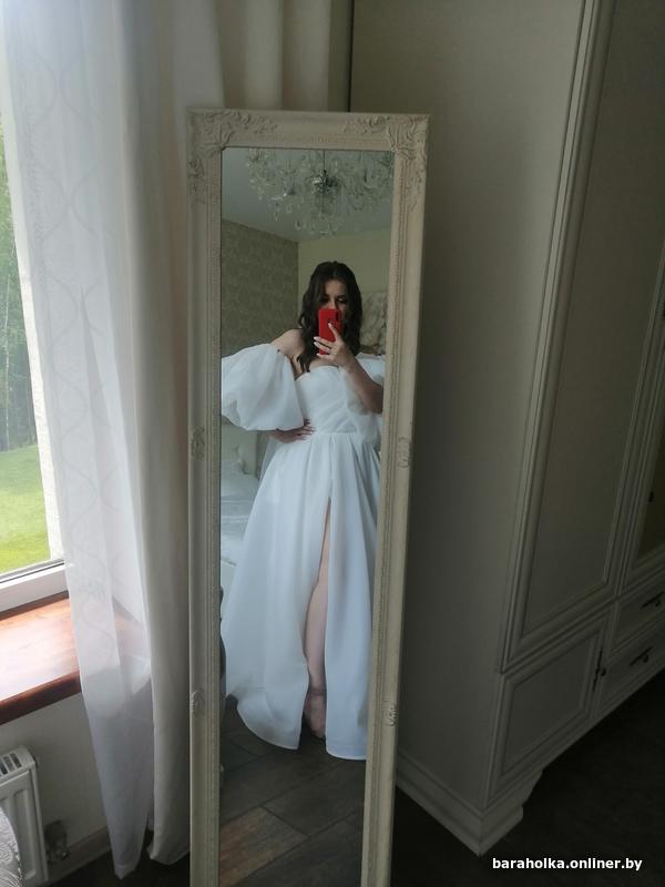 Идеальное платье из органзы (самая красивая, практичная, фотогеничная и актуальная ткань), минималистичное и изящное, с разрезом. На размер 42-44, шлейф комфортной длины, подкалывается, рукава съёмные. Удобный корсет на шнурке, благодаря которому платье не будет сползать. А что самое главное, корсет сядет идеально на любую грудь. В этом платье продумано все для комфорта невесты.