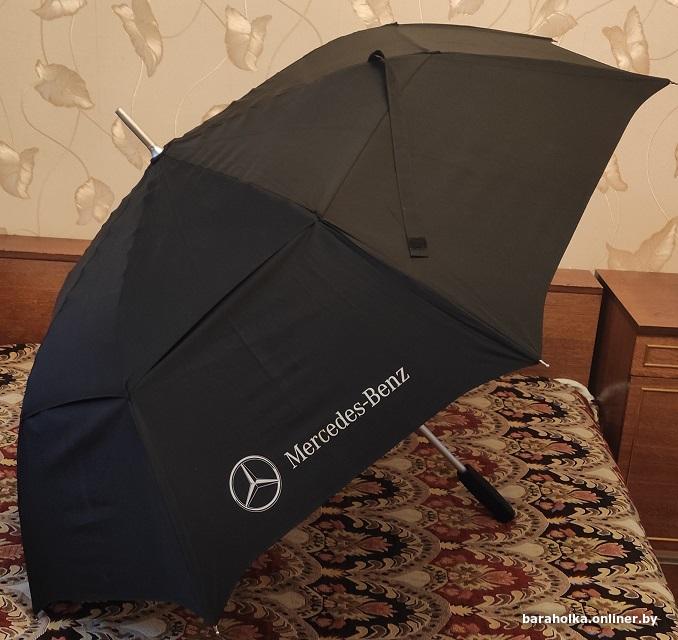 Зонт Mersedes-Benz: большой, семейный, фирменный подарок от автозавода Daimler AG Stuttgart Germany (фирменный ярлык и логотип с надписью), оригинальная конструкция, раскрыв купола 125 см, длина в сложенном состоянии 97 см, два матерчатые ремешки-застежки, купол состоит из двух отдельных частей («юбок», которые перекрываются), в сложенном состоянии фиксация простым надежным стопором с кнопкой, вручную легко раскрывается и складывается, очень надежная конструкция, легкий (вес 600 грамм), б/у в отличном состоянии. Цена 105 рб.
