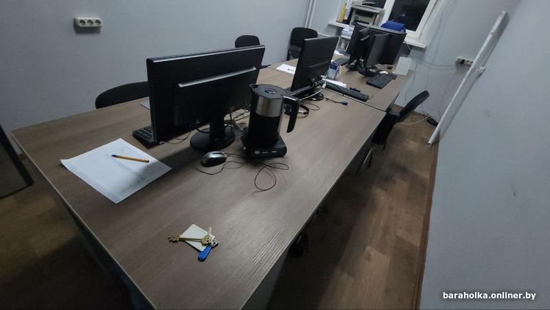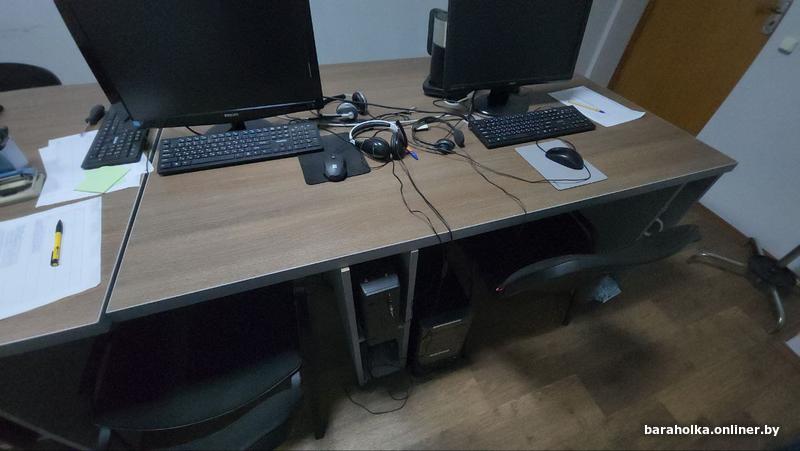 Массивные столы, толщина 3.6 см, 2 м на 1.2 м, и опоры с функцией хранения системных блоков и документов. Очень удобная система можно соединить в один длинный стол. Экономит места на столе и в шкафах. Каждый стол + 4 тумбы по 200