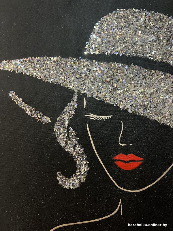 Изысканная интерьерная картина «Женщина в шляпе» (50×70 см) выполнена вручную в смешанной технике: акрил, стеклянная крошка.