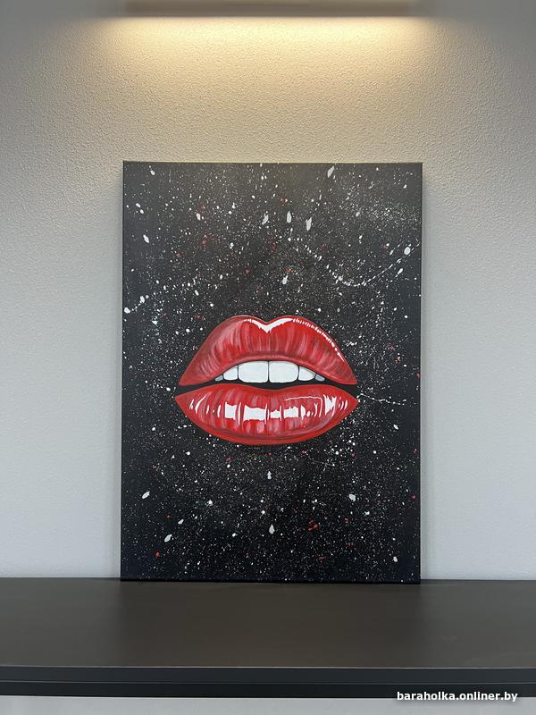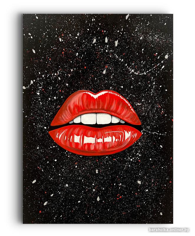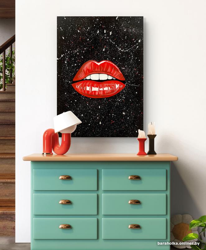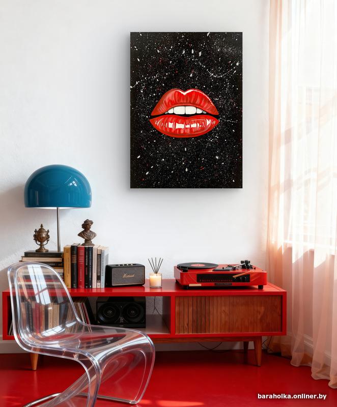 Глянцевые красные губы на фоне динамичных брызг создают эффект движения, энергии и смелой экспрессии. Картина сразу притягивает взгляд и становится центральным элементом пространства.