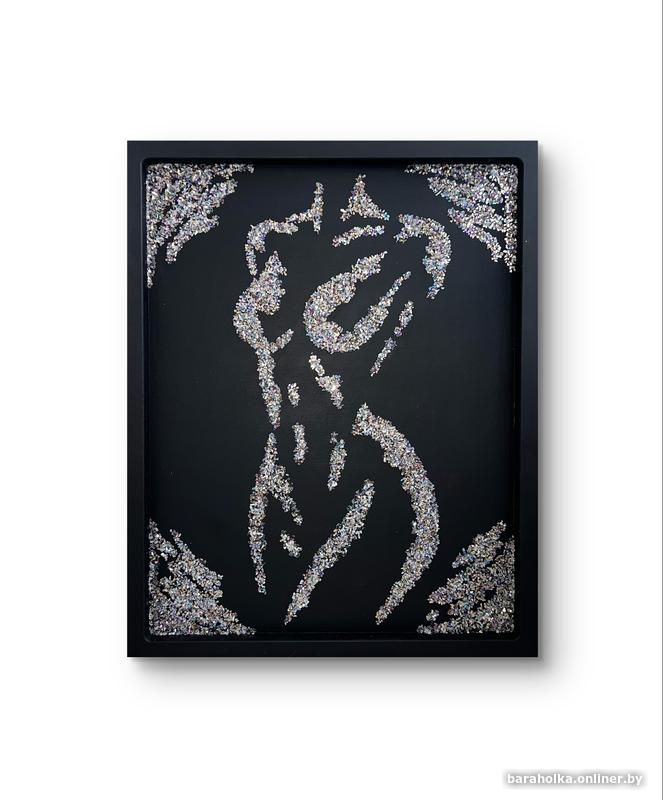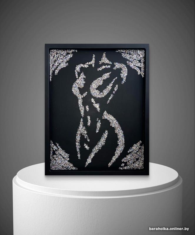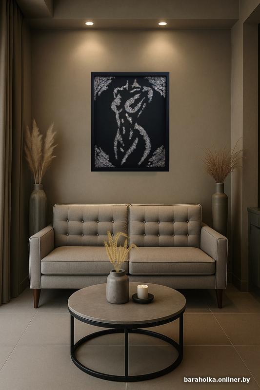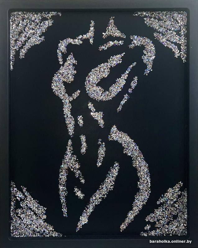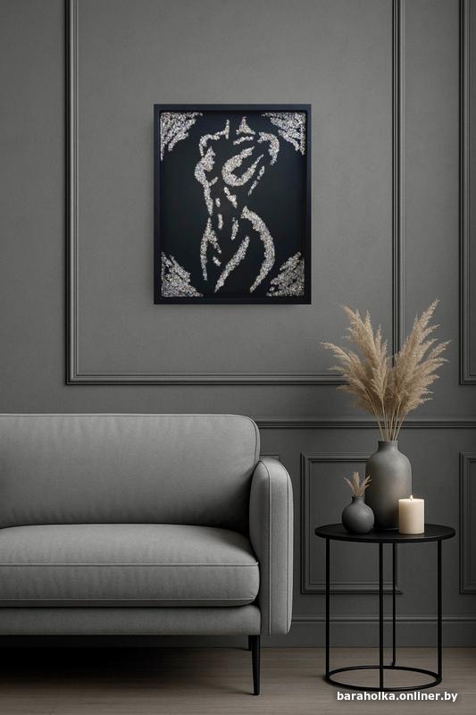 Элегантное интерьерное панно «Женский силуэт» — утончённый акцент, который подчёркивает красоту, лёгкость и женственность пространства. Размер 60×70 см. Работа выполнена вручную с использованием сияющей стеклянной крошки, которая создаёт эффект мерцающего рельефа и красиво переливается при освещении.