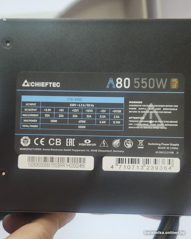 Полумодульный блок питания CHIEFTEC А-80 CTG-550C на 550 Вт. 230V, 6А, 50 Hz, +12V1 +12V2 combined 495W. Отдельные кабели: 8 PIN PCIe (6+2) x2, SATA x2, MOLEX/FLOPPY x2, 100 руб.
