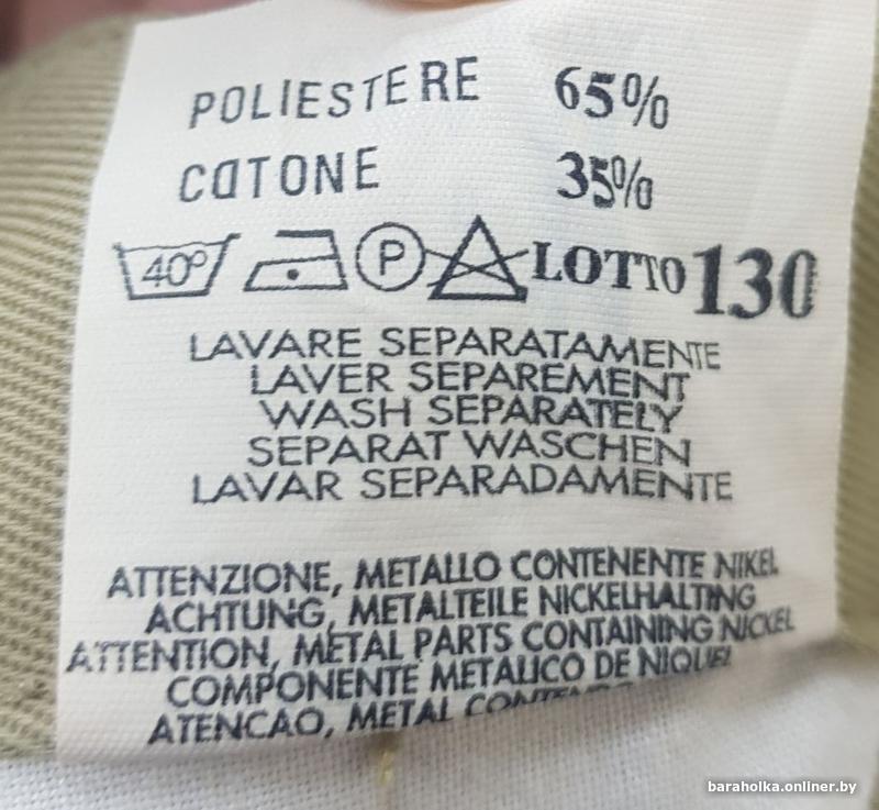 Состав: "POLIESTERE 65% COTONE 35%" (Полиэстер 65%, Хлопок 35%). "40°" (Стирка при 40°). "P" в треугольнике (Профессиональная чистка). "LOTTO 130" (Партия 130).