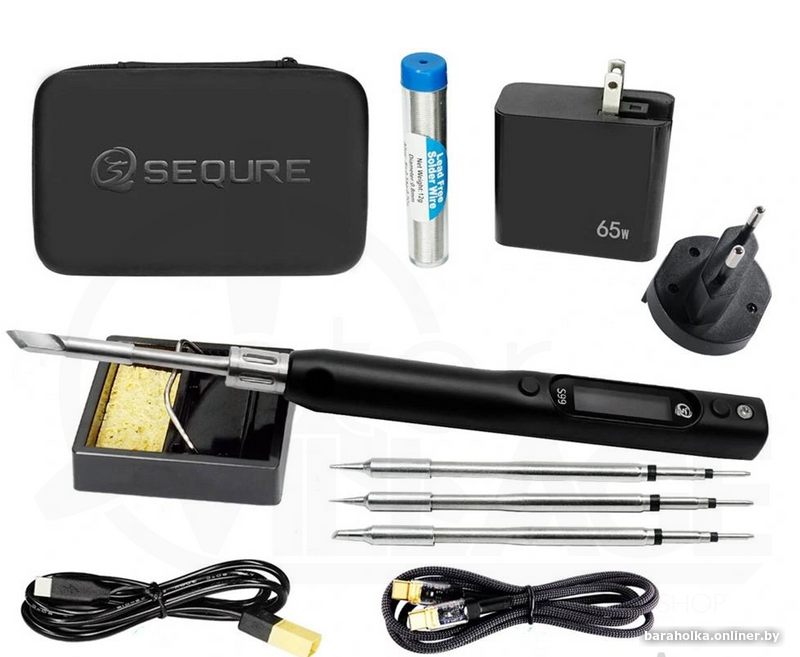 Паяльник Sequre S99, Абсолютно новый, полный комплект, кейс, набор сменных жал (K / B1 / I / BC2), подставка под паяльник, кабель питания для быстрой зарядки Type C – Type C, кабель XT60 – Type C, блок питания 65w, припой, инструкции в виде qr-кода для скачивания.