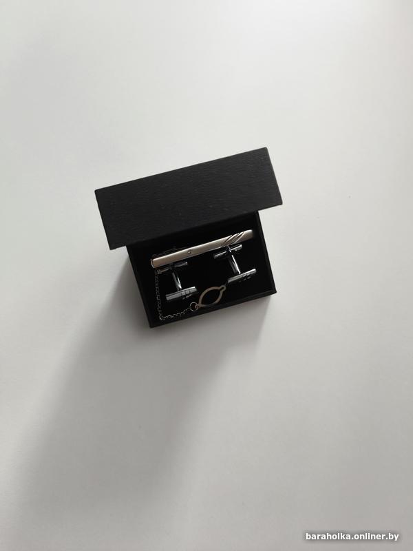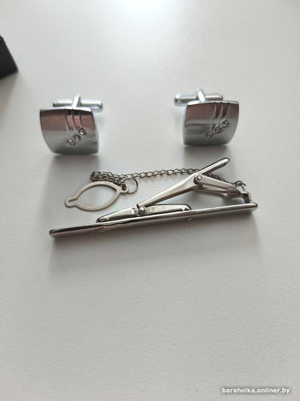 Запонки 1,5*1,5 см, зажим 6 см в коробочке. Пользовались 2 раза.