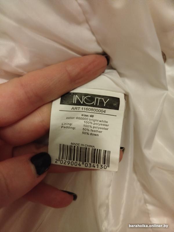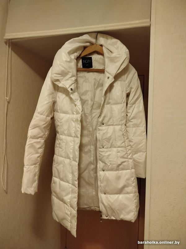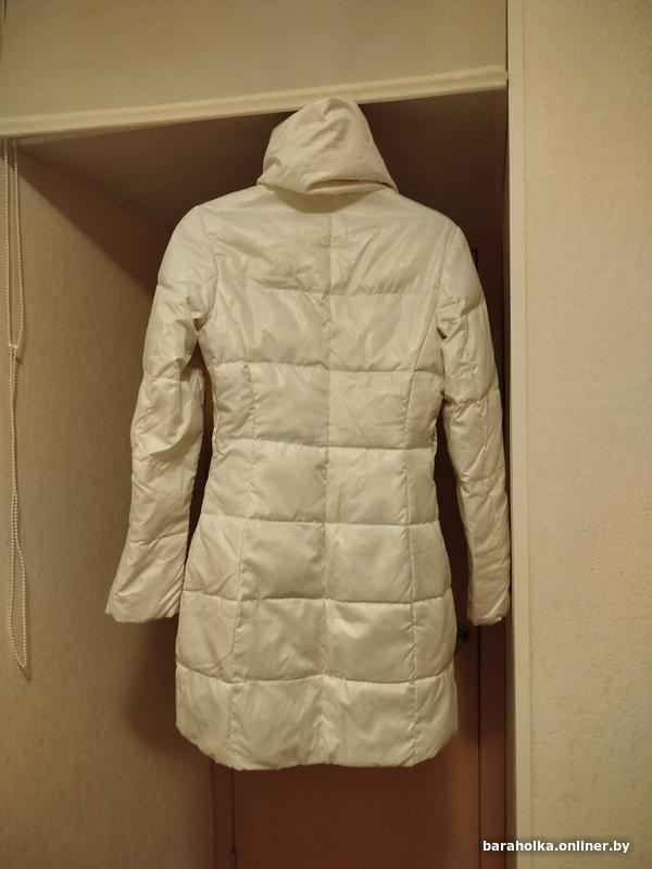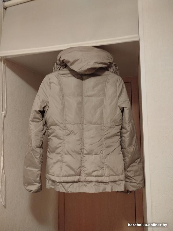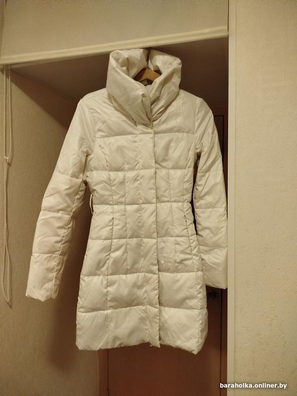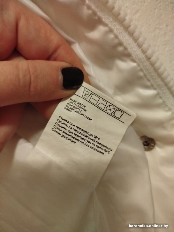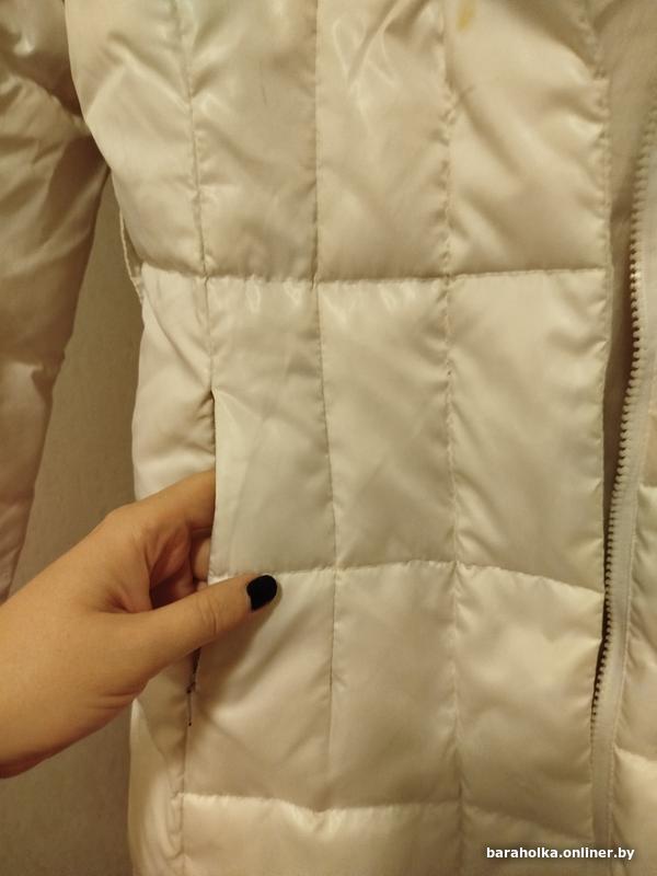 Есть маленькое пятнышко впереди, нет пояса, но он не нужен: пуховик приталенный.