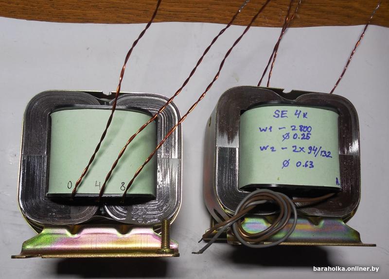 Выхадныя трансы 4к \4 Ом\ 8 Ом для аднатактнага унча. Намотка секцыямі, ізаляцыя - папера. Намотка на жалезе ОСМ-1 0.1 кВт. Разлічаны на лямпы 6П14П, 6П3С, 6П13С, 6П36С і інш.