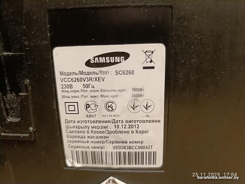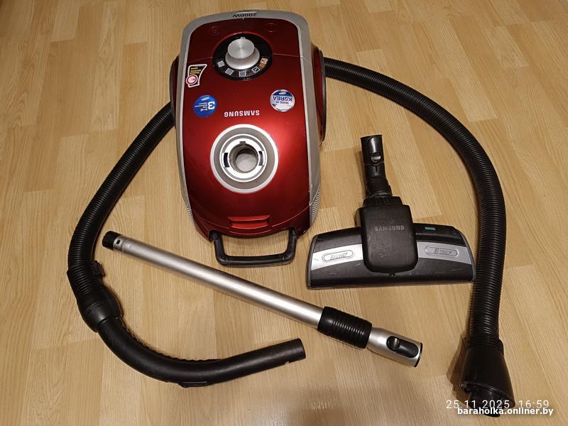 Пылесос Samsung SC 6260. Мощность потребления 2000 вт. Мощность всасывания 400 вт. Регулировка мощности на корпусе. Телескопическая алюминиевая трубка и большая ковровая щетка с отдельными фиксаторами. Многоразовый мешок для мусора на 3 л. Фильтр тонкой очистки НЕРА 13 Silver Nano. Низкий шум 67 дб. Ш- 28,8 см; Г-44,5 см; В-24 см. Вес 8,3 кг. Вертикальная парковка. Пылесос в отличном внешнем и техническом состоянии - подымает ковры. Мало использовался. Полностью вымыт. Производство Корея. Отдельно есть новая турбо-щетка для чистки ковров плюс 40 рублей. Отвечаю только на звонки. +375(29)137-68-20.