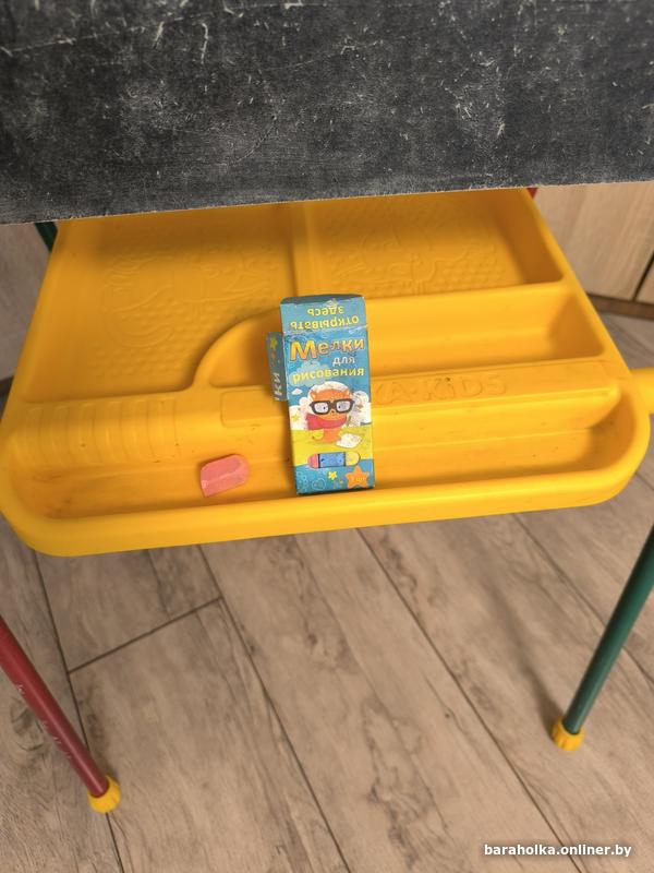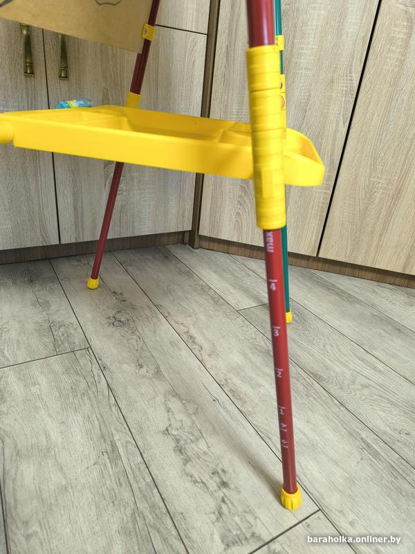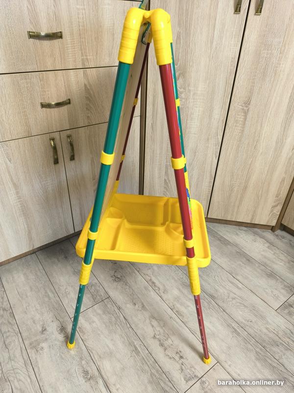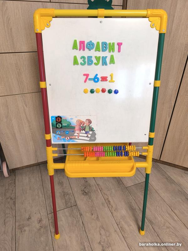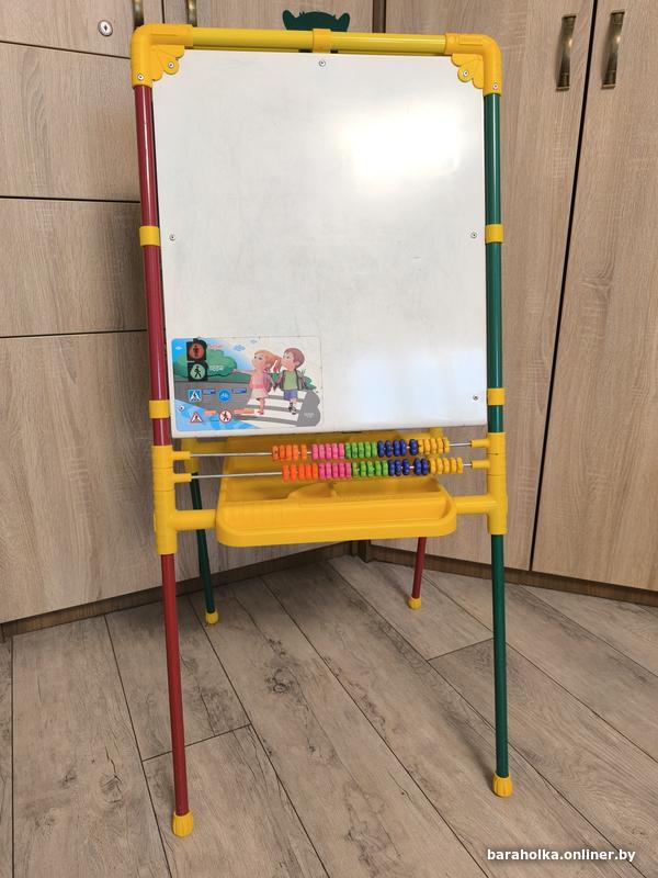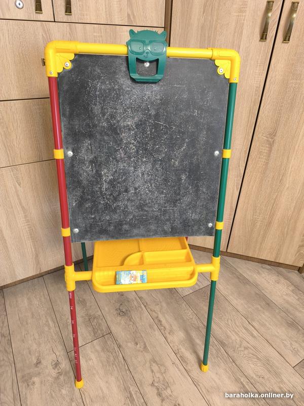 Мольберт имеет две стороны, одна магнитная - на которой можно изучать буквы и цифры с помощью соответствующих магнитов, либо писать специальными маркерами, вторая - предназначена для написания мелом. Можно регулировать по высоте.