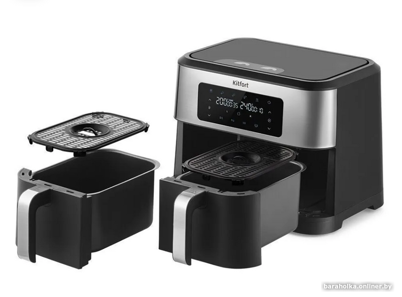 Современный аэрогриль КТ-2249 с 2 раздельными нагревателями и 2 поддонами позволяет готовить большинство продуктов без добавления масла, а также может использоваться как сушилка для фруктов и овощей. Готовьте 2 блюда одновременно!