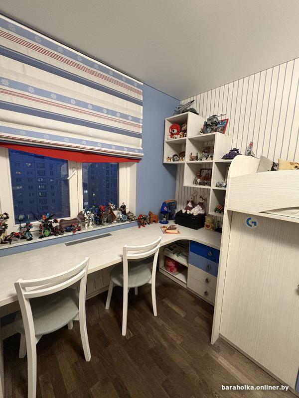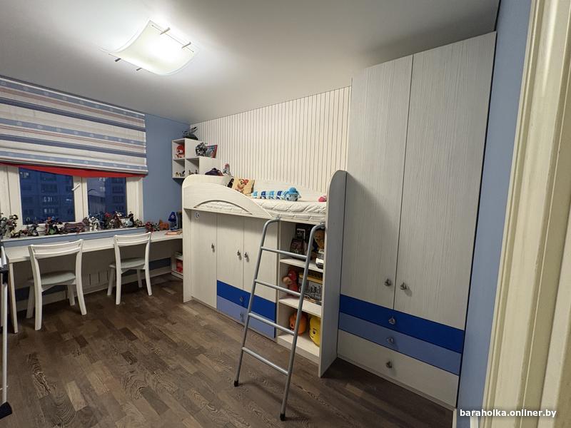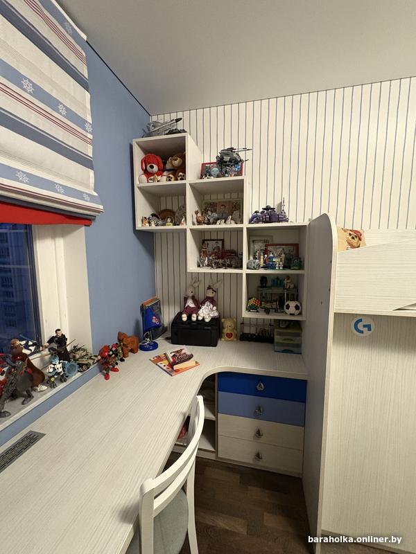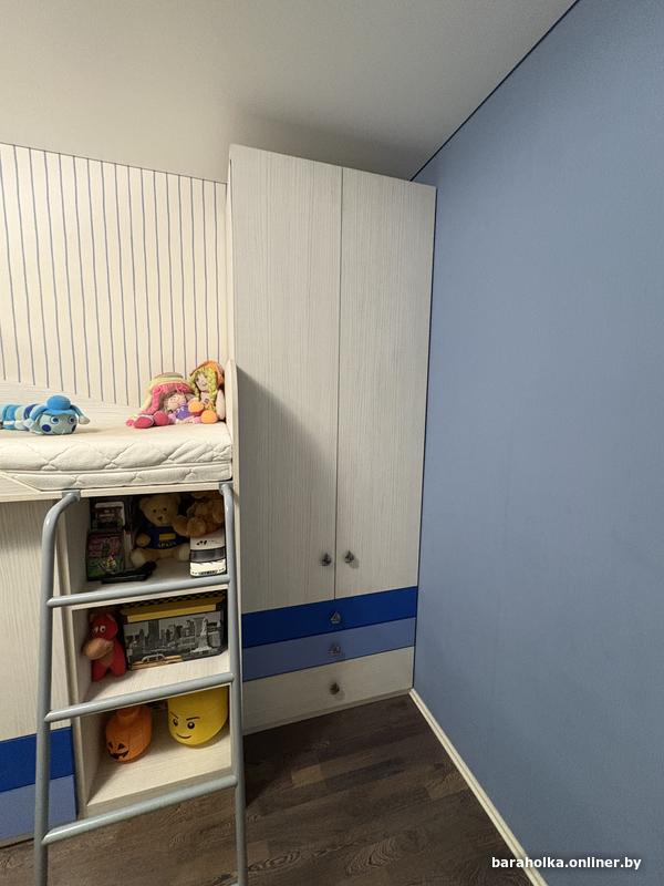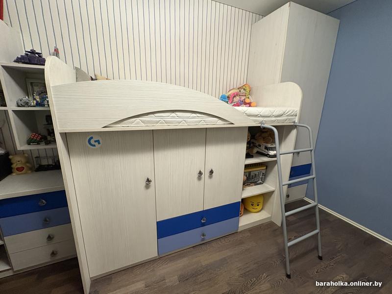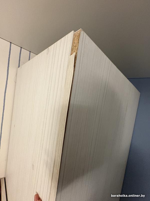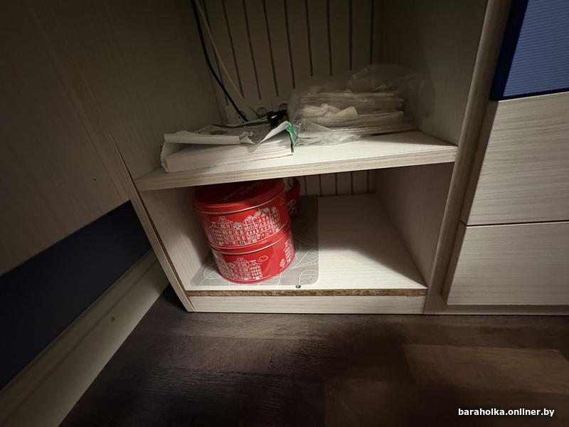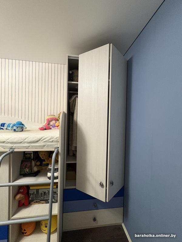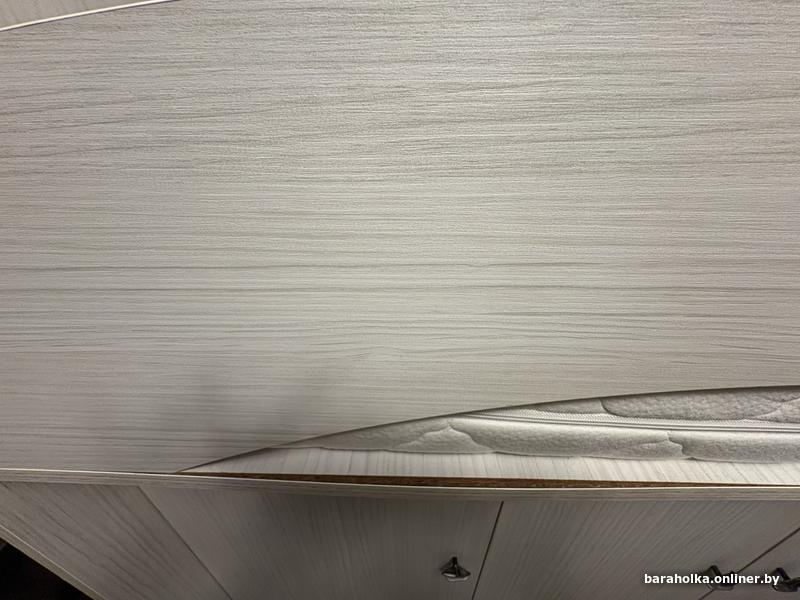 Состояние- хорошее. Есть дефекты- отсутствие кромки в полке под столом, так же отставание кромки по длине кровати и у верхнего края шкафа.