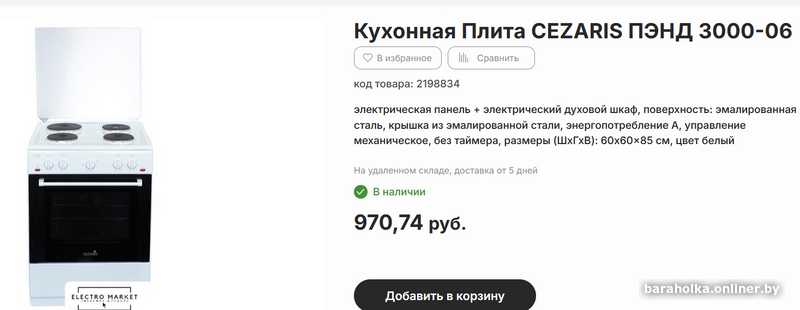 Электрическая плита CEZARIS ПЭНД 3000-06. Электрическая панель + электрический духовой шкаф, поверхность: эмалированная сталь, крышка из эмалированной стали, энергопотребление A, управление механическое, без таймера, размеры (ШхГхВ): 60x60x85 см, цвет белый. Объём духового шкафа 59 л. Общая мощность 5000 Вт. Количество уровней мощности - 8. Нижний + верхний нагрев. Забирать на Каштановой.