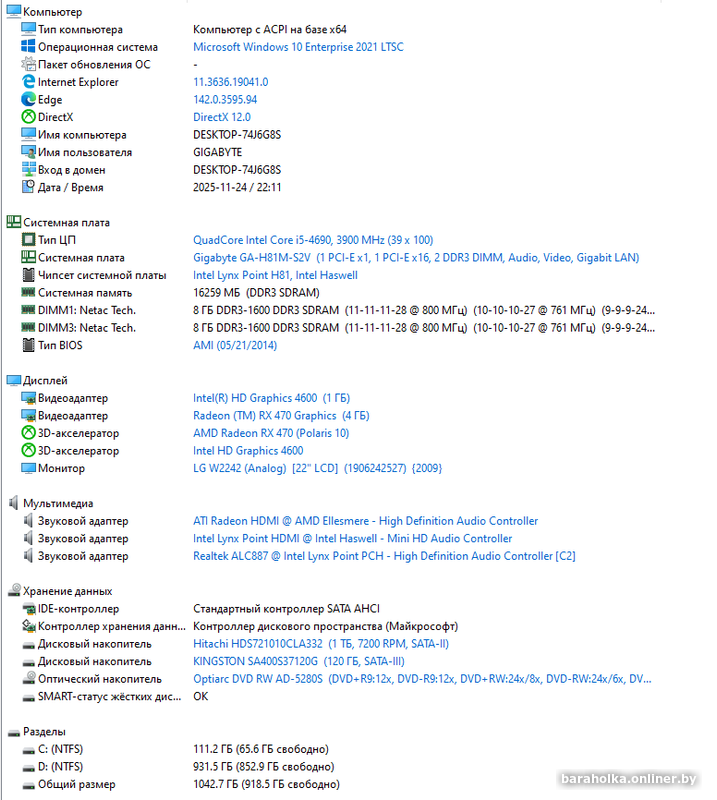 • накопитель SSD Kingston 120Gb + HDD Hitachi 1000Gb SATA-3