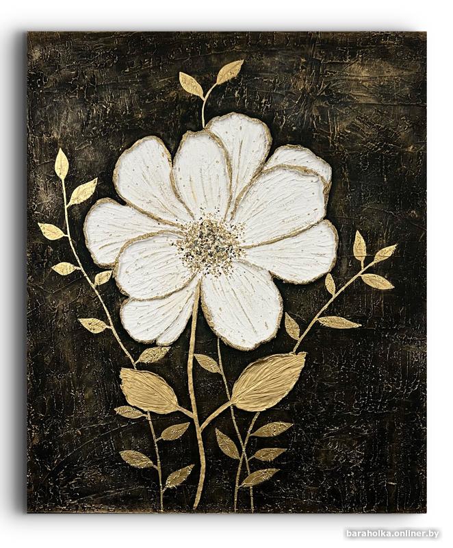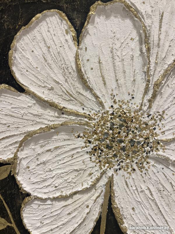 Изысканная фактурная картина на холсте 60×70 см. Объёмные лепестки выполнены из воздушной текстурной пасты и подчёркнуты линиями