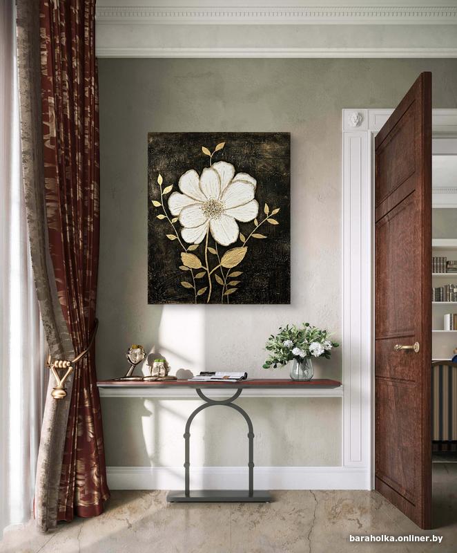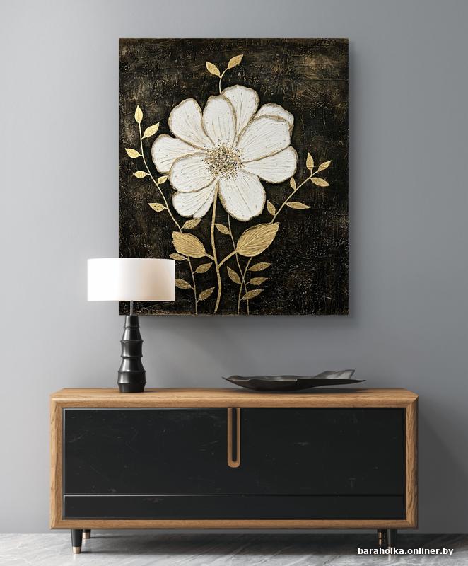 Глубокий тёмный фон и тёплое золотое свечение лепестков создают настроение вечерней роскоши и спокойного света. Картина выглядит премиально и станет ярким акцентом в современном интерьере.