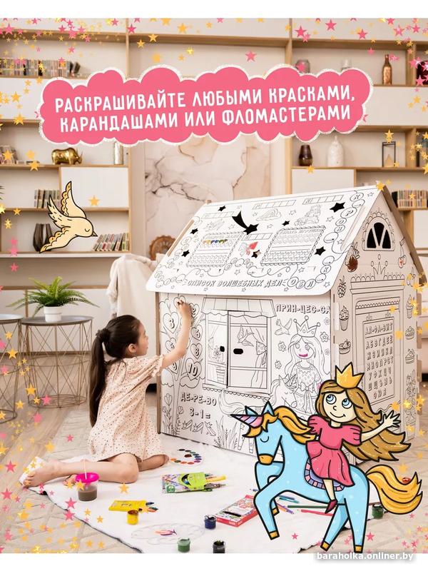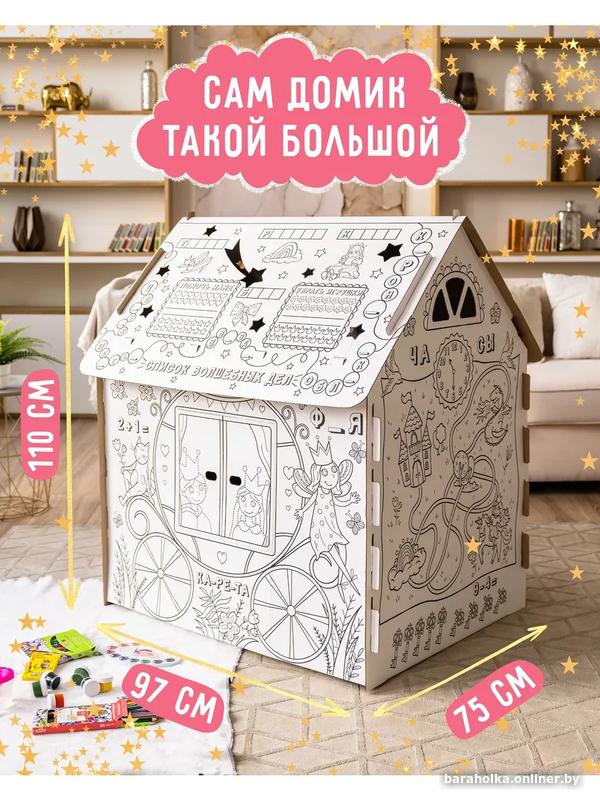 Картонный домик-раскраска. Новогодний. Набор наклеек. Производство Россия. Новый. В упаковке. Высота 110 см, глубина 97 см, ширина 75 см. Картонный домик для девочки поможет освоить навыки счета, чтения, рисования. Домик из плотного картона большой, высокого качества можно раскрашивать карандашами, красками, фломастерами. Набор наклеек. Может стать игровым домиком для ребенка.