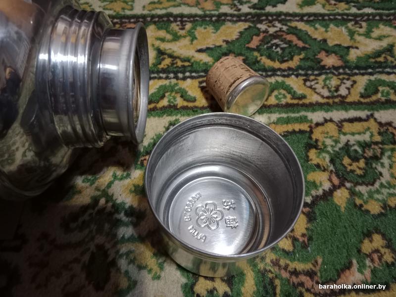 Термос закрывается алюминиевой крышкой, которую можно использовать в качестве кружки. Под крышкой находится пробка. Зеркальная колба из закалённого пищевого стекла, которая хорошо держит тепло по сравнению с современными термосами.