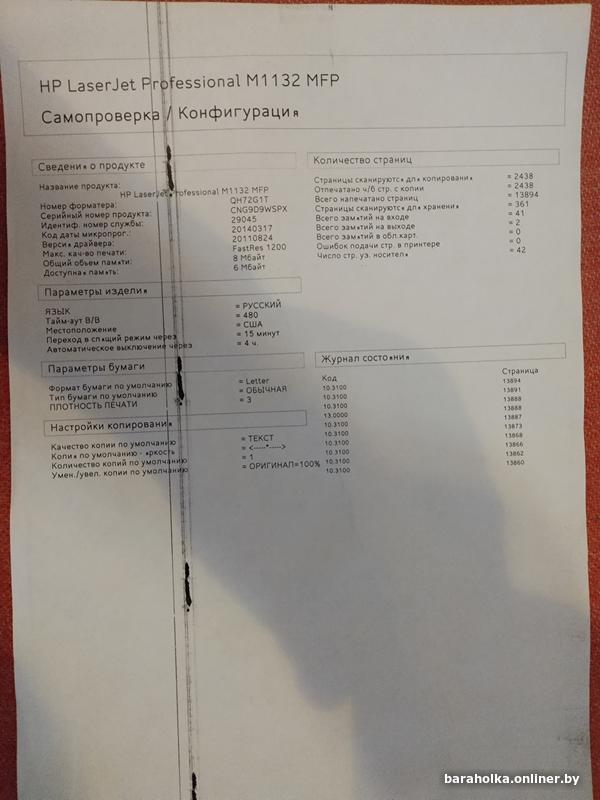 Продам МФУ HP Laser Jet M1132 MFP. Всё работает: принтер, сканер, копир. В любой Windows определяется без проблем. К бумаге не капризный. Работает тихо и быстро, в отличии от других HP. Пробег 14 тыс, в ремонте не был. Язычок на выпуск листов зацепил и отломались крепления, можно использовать без языка или прикрутить винтом. В картридже тонер есть, но лучше заменить. Доставал лист и поцарапал барабан сейчас пускает полосу. В комплекте МФУ, шнур питания и шнур USB. Причина продажи стоит без дела. 400 руб., возможна доставка в пределах Минска. Отправлю Белпочта/Европочта по предоплате.