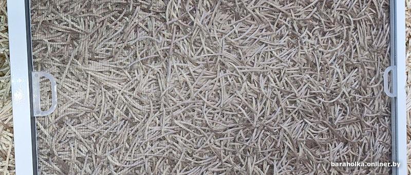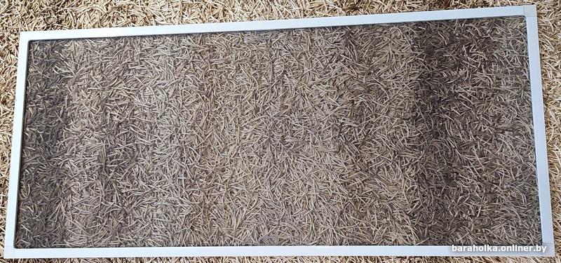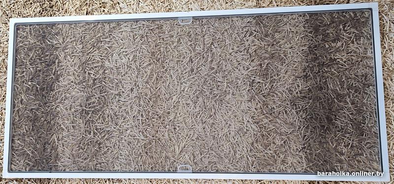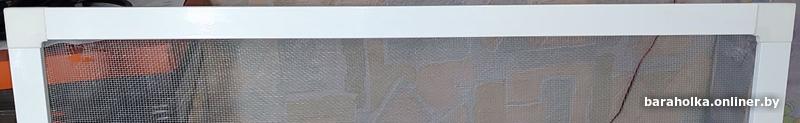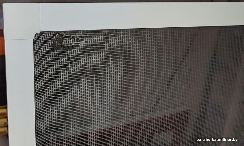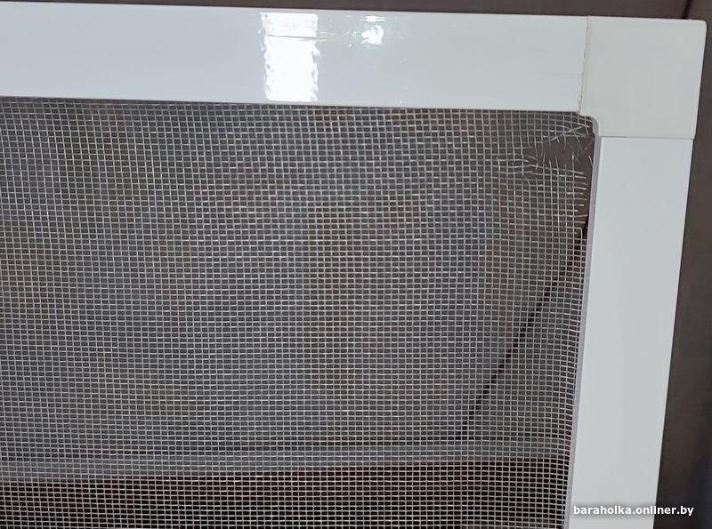 Москитная сетка в сборе: рама, сетка с ручками, шнур-фиксатор. Есть два небольших дефекта (сетка разошлась) в двух из углов (фото №4-6). Рама и ручки - белые, сетка и шнур - серые