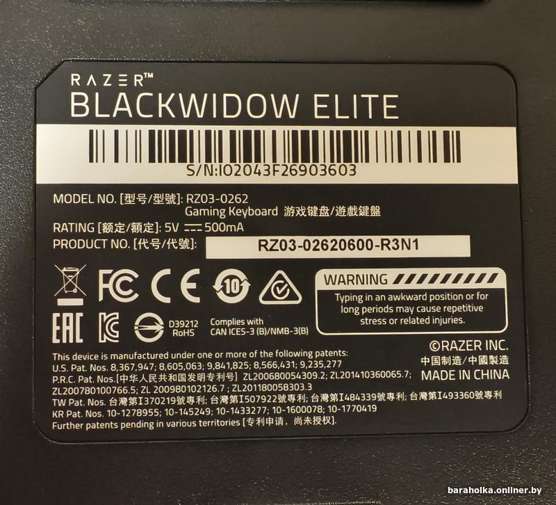 Полноразмерная механическая клавиатура Razer BlackWidow Elite с мультимедийными кнопками и колесиком громкости. Оригинал – модель RZ03-0262, серийный номер на шильдике виден на фото.