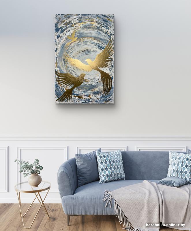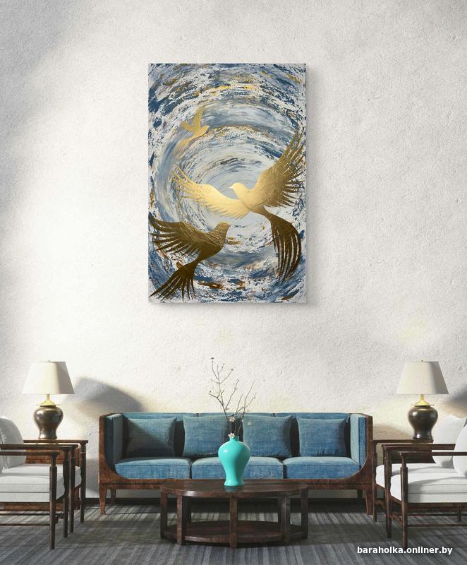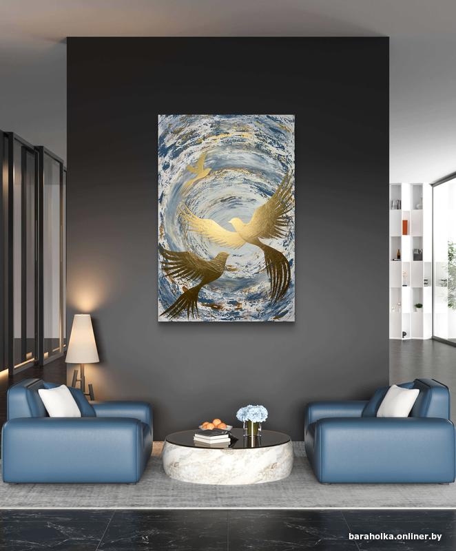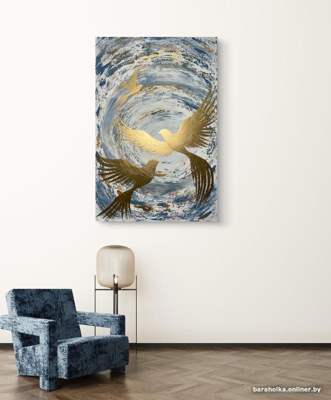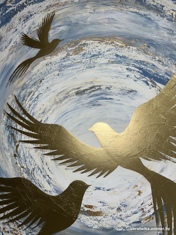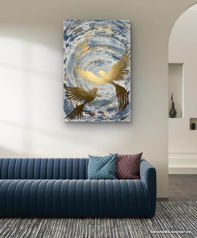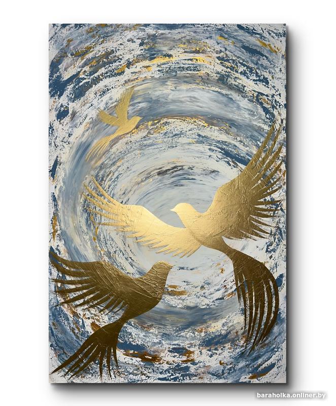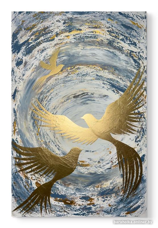 Картина о движении вперёд, о внутреннем подъёме и ощущении пространства. Золотые птицы подчёркивают тему независимости и лёгкости, а динамичный фон создаёт ощущение направления и энергии. В живую картина выглядит впечатляюще и вдохновляет композицией. В единственном экземпляре. Стильный подарок на праздничное событие.