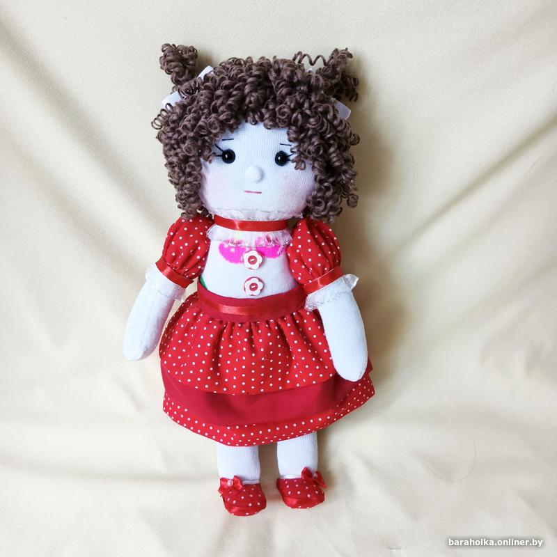 1. Куколка текстильная с кудряшками, в красной юбочке в горошек. Ручная работа. Очень мягкая, наполнена холлофайбером. Высота 30 см.
