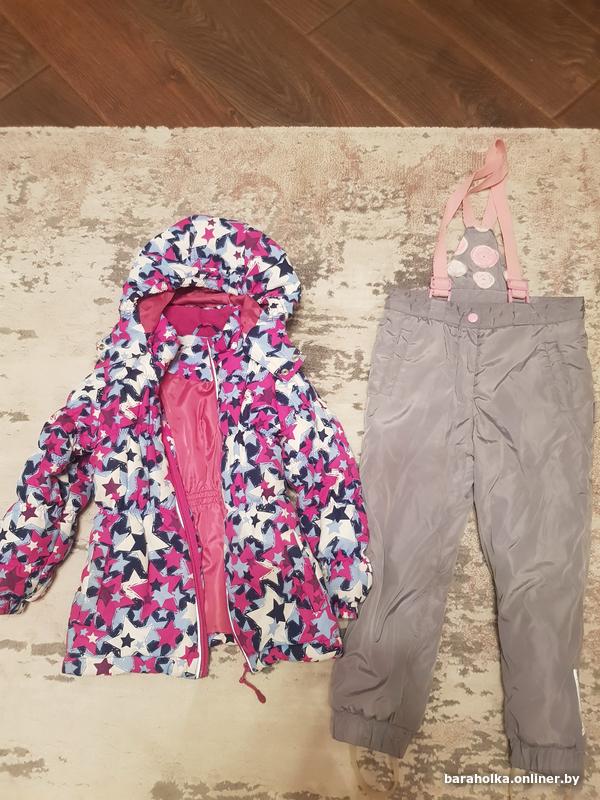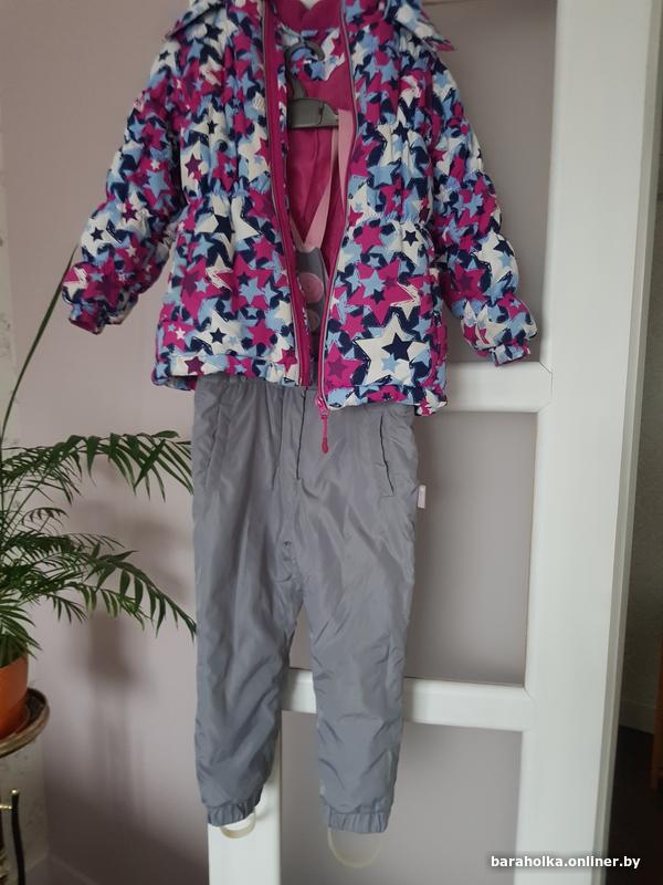 Зимний комплект (куртка+штанишки на подтяжках), рост 110 см. Куртка: плечи 33 см, рукав 41 см, длина куртки 50 см., капюшон отстегивается. Штанишки: длина 66 см, шаговая длина 43 см., на подтяжках, внизу фиксируются лямками.Жодино