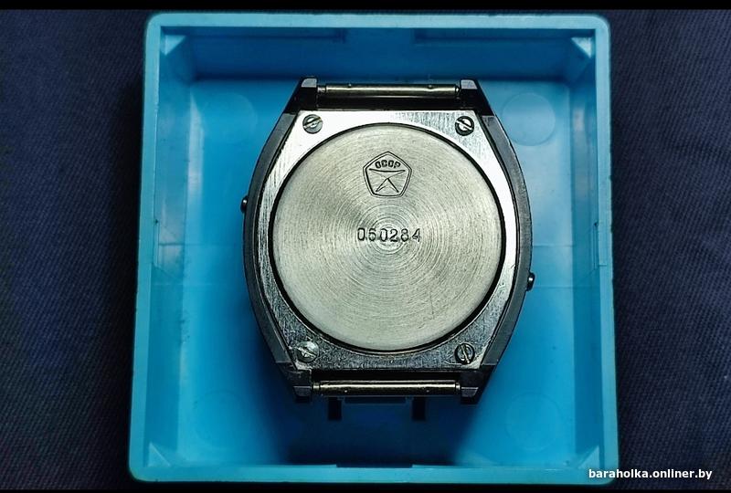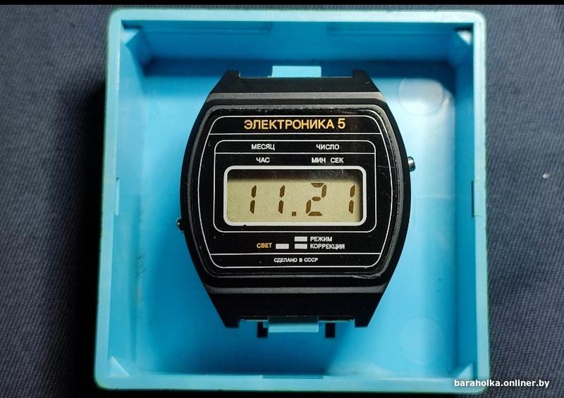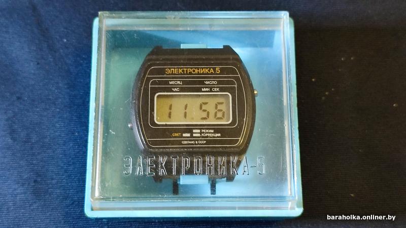 Одни из самых лаконичных часов производства НПО "Интеграл", разработки еще начала 1980х. На дисплее 4 крупных цифры - ничего лишнего. Отображают часы и минуты, или секунды, или дату. Корпус пластиковый. Внутри советский электронный блок с позолоченными дорожками, родная советская коробка-футляр с надписью "Электроника 5"