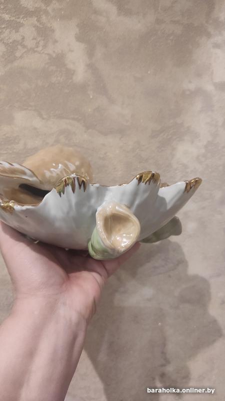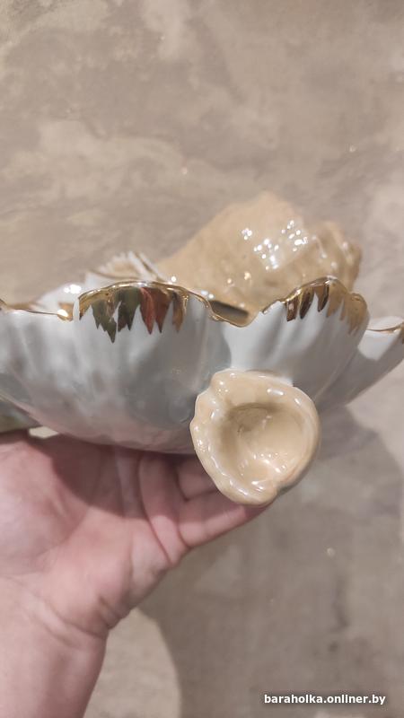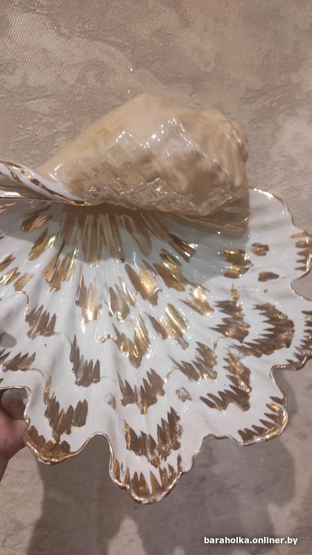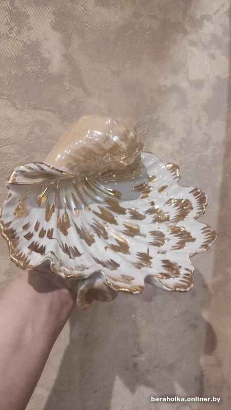 Красивая ракушка - ваза, большая, очень интересная. Увесистая, размер 24 на 23 см, высота 12 см. Советского времени, хорошее состояние. Сколов нет, есть естественные потертости "позолоты". В общем, просто отличное состояние для такой вещицы.
