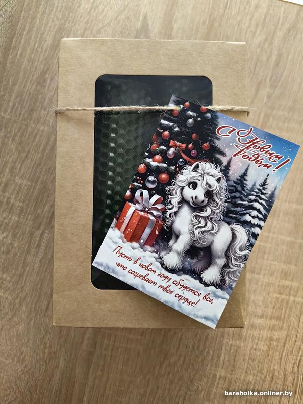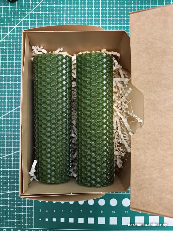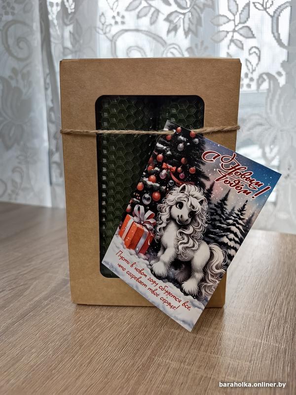 Красивый подарок ручной работы- 2 свечи из натуральной вощины, зеленые, как цвет новогодних елочек, упакованные в крафтовую коробку, завязанную джутовым шпагатом с подарочной новогодней открыткой- символом 2026 года- лошадкой с милым пожеланием. Высота каждой свечи 13 см, а диметр 4 см. Порадуйте себя или своих близких оригинальным, натуральным и красивым подарком.