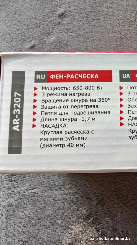 Описание: Фен-расческа ARESA AR-3207 – современный прибор, который соответствует всем сертификационным нормам. Фен AR-3207 прошел сертификацию в едином центре ГОССТАНДАРТА Республики Беларусь, благодаря этому все показатели прибора соответствуют заявленным характеристикам. При правильно подобранном режиме, прибор никогда не повредит и не пересушит ваши волосы. Так же прибор может быть использован для сушки детских волос. Фен AR-3207 имеет мощность 800 Вт, что позволяет устройству быстро высушить мокрые волосы и справится с любой укладкой. С помощью возможности выбора режима нагрева, вы сможете подобрать подходящий именно вашему типу волос – сухие и ломкие, легкие или тяжелые волосы не будут повреждены. Фен AR-3207 имеет 3 режима нагрева. С помощью насадки с мягкими зубьями, диаметром 40 мм, вы сможете создать укладку любой сложности: добавить объем у корней или сделать легкую волну. Фен-расческа ARESA AR-3207 имеет компактный размер, что делает его незаменимым в любой поездке или для похода в бассейн. Он не займет много места. Особое крепление шнура позволяет ему вращаться на 360, он не заламывается и не перекручивается, а это обеспечивает легкость и комфорт в использовании. Фен-расческа AR-3207 оснащен петлей для подвешивания для удобного хранения. Благодаря стильному дизайну прибор может стать отличным подарком. ARESA – белорусский бренд бытовой техники. Наша техника проходит сертификацию на территории Республики Беларусь в едином центре ГОССТАНДАРТА. Кроме сертификатов таможенного союза, полученных на территории Республики Беларусь, техника ARESA соответствует всем нормам сертификации Европейского Союза и поставляется на его территорию. Приобретая нашу технику, вы заботитесь о здоровье и безопасности вас и ваших близких.