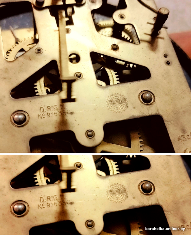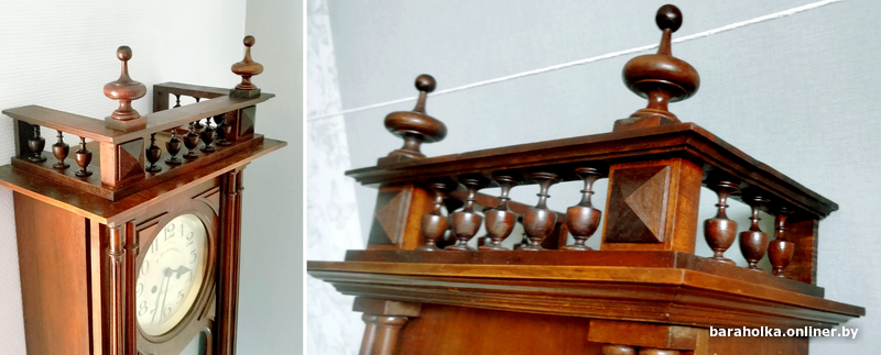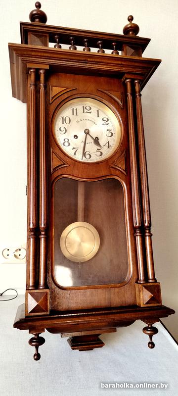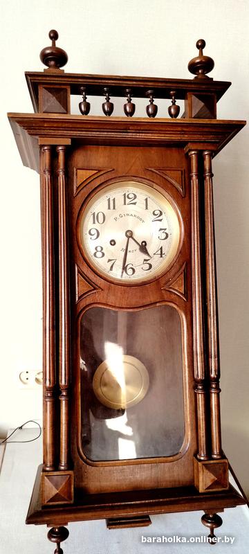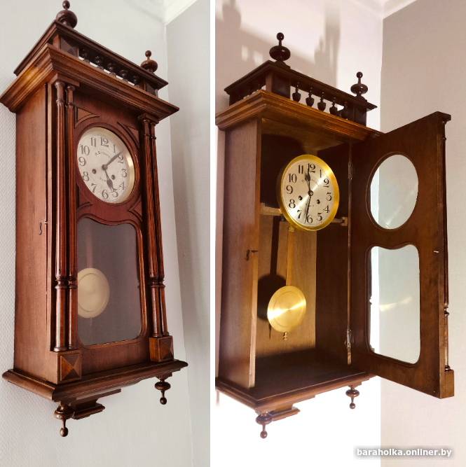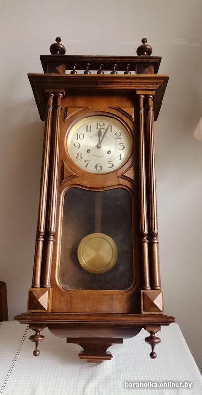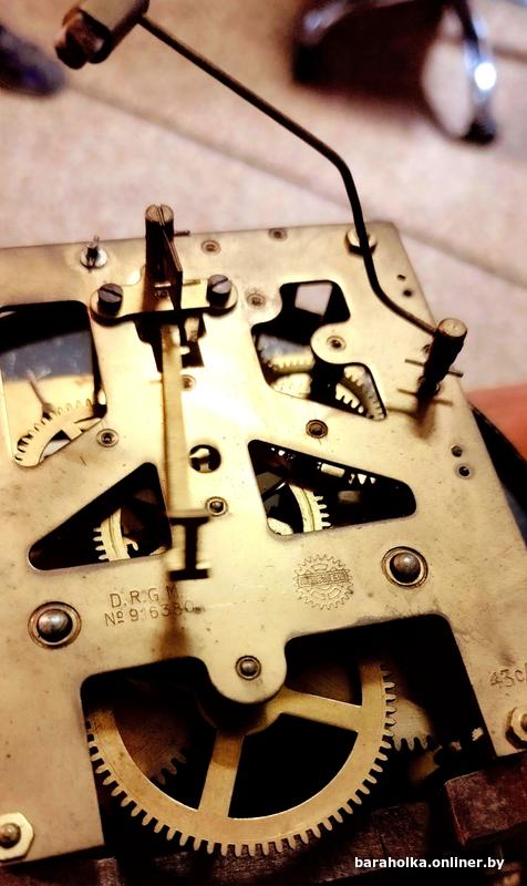Часы в рабочем состоянии. У мастера произведена чистка и смазка механизмов без замены деталей. Ход ровный, завод от ключа. Отбивают полный бой каждый час и один удар гонга каждые полчаса.